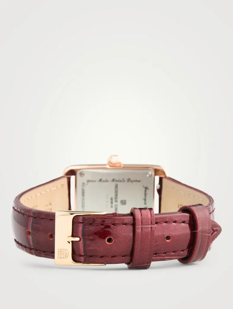 Timeless and luxurious, this Classics Carrée watch from Fréderique Constant evokes glamour with its square shape, and classic white dial with intricate “Clous de Paris” decoration. The gold case is perfectly offset by a rich red leather strap finished with crocodile embossing.