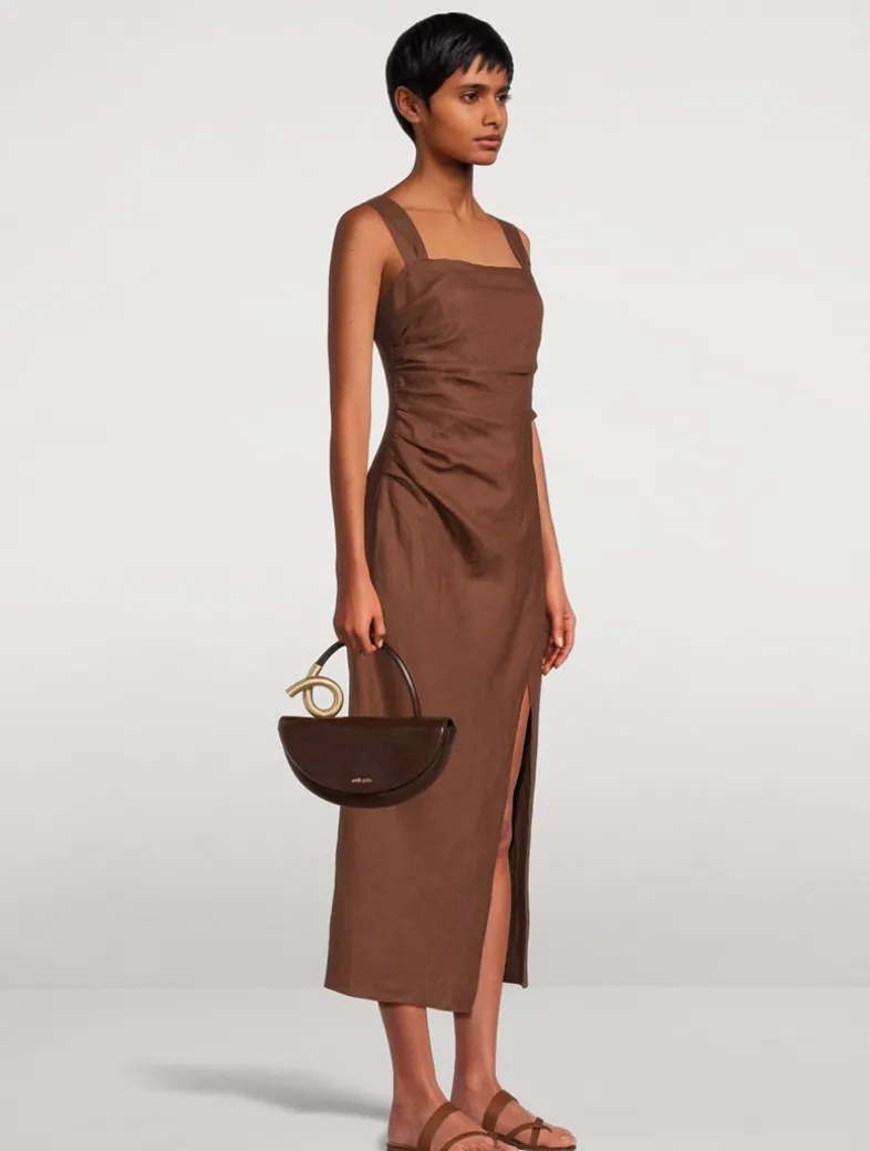 This dress is crafted from a lightweight linen. Its bodice has a square neckline framed by wide shoulder straps, paired with a slim column skirt finished with a cut-up-to-there slit. Bluesign® certified.