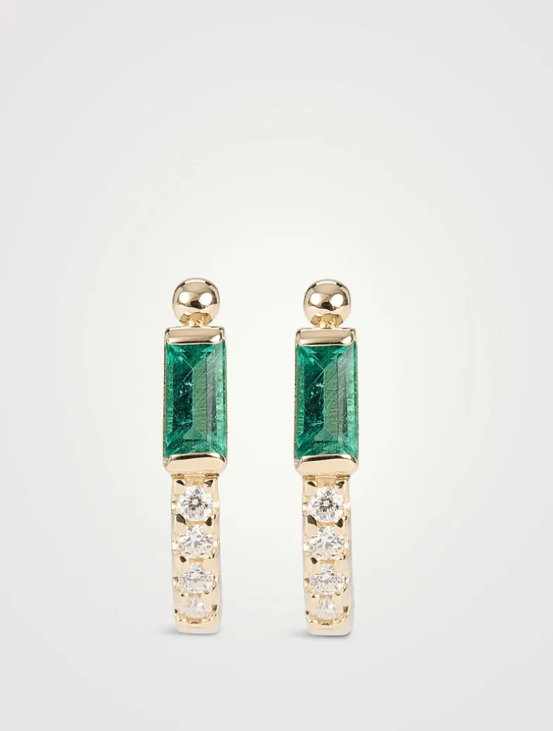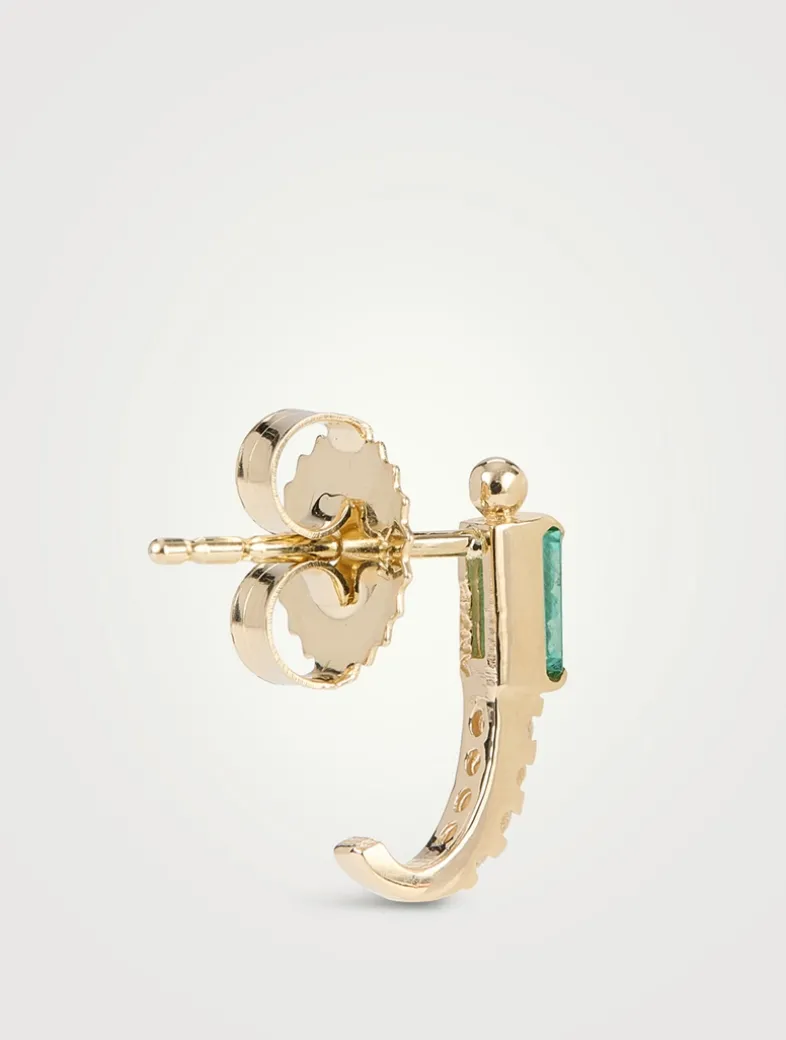 Brilliant channel-set emeralds are mounted on gold posts with a pavé half hoop, making these dainty earrings a perfect staple for layering or for those who prefer minimal pieces.