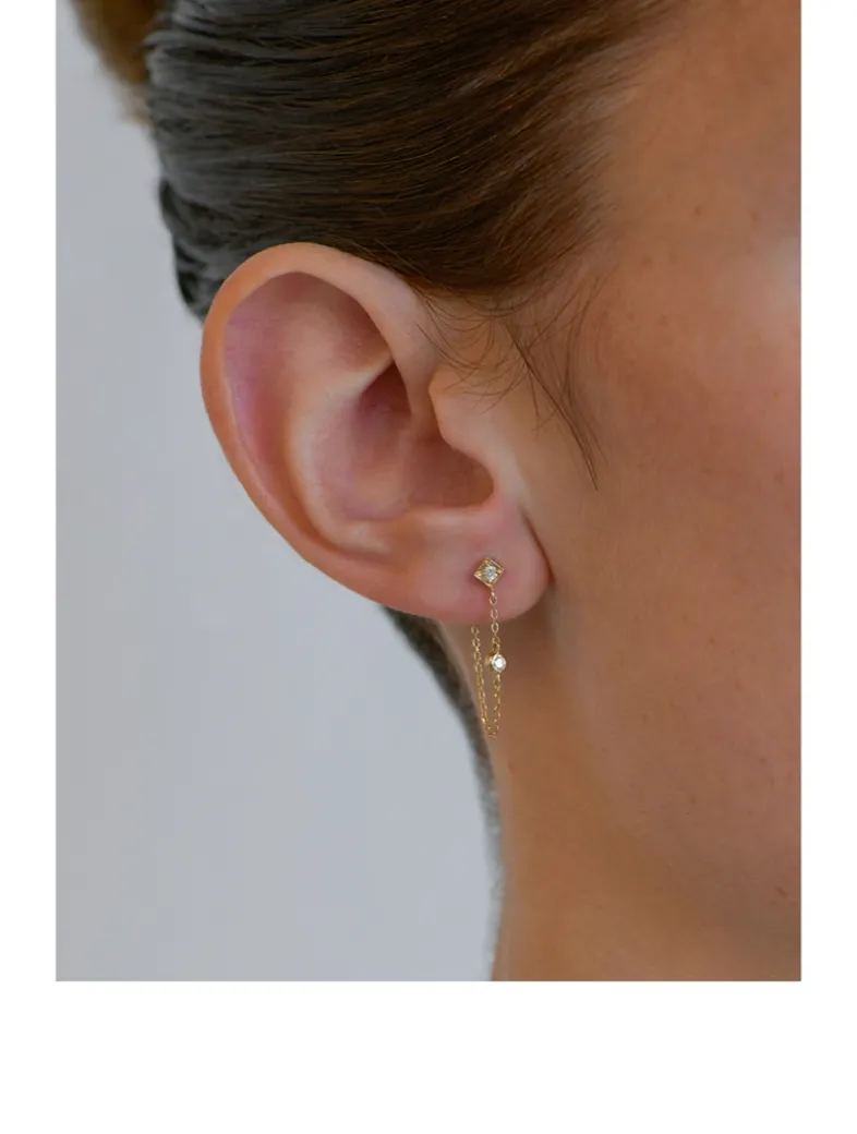 A dazzling rhombus cut gemstone is prong set and mounted on a gold post. Diamond cut chains adorned with diamonds are suspended from the stud and connect to the butterfly back. This dainty earring is perfect for everyday wear and to layer.