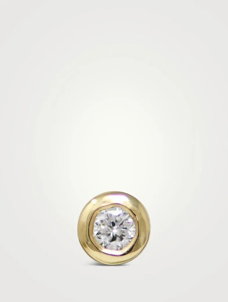 Juxtaposing symmetry and opposites, the Cléo collection puts a playful spin on formal pieces. Delicately mounted on a gold post, this stud earring features a dazzling diamond encrusted in a dainty bezel setting.
