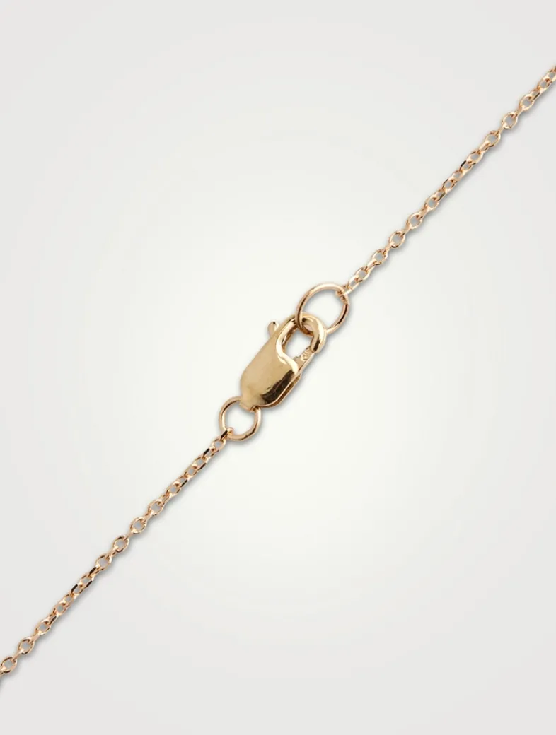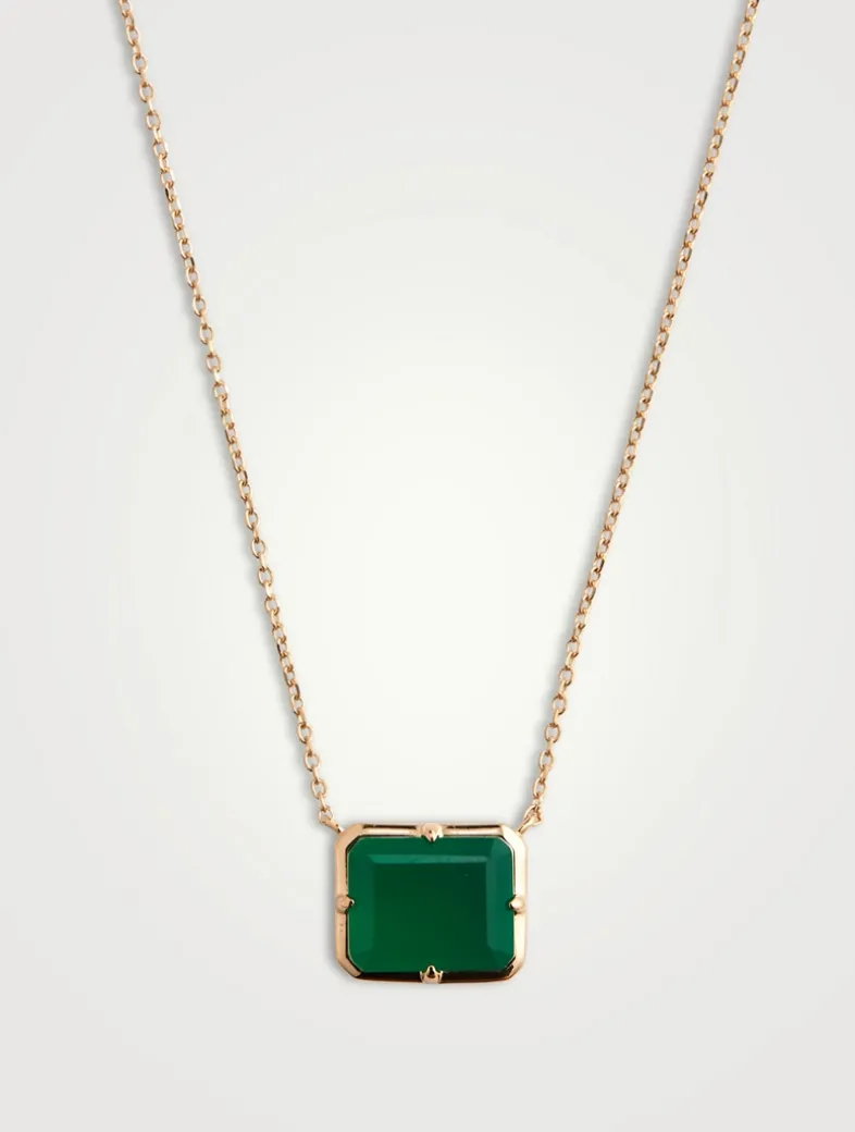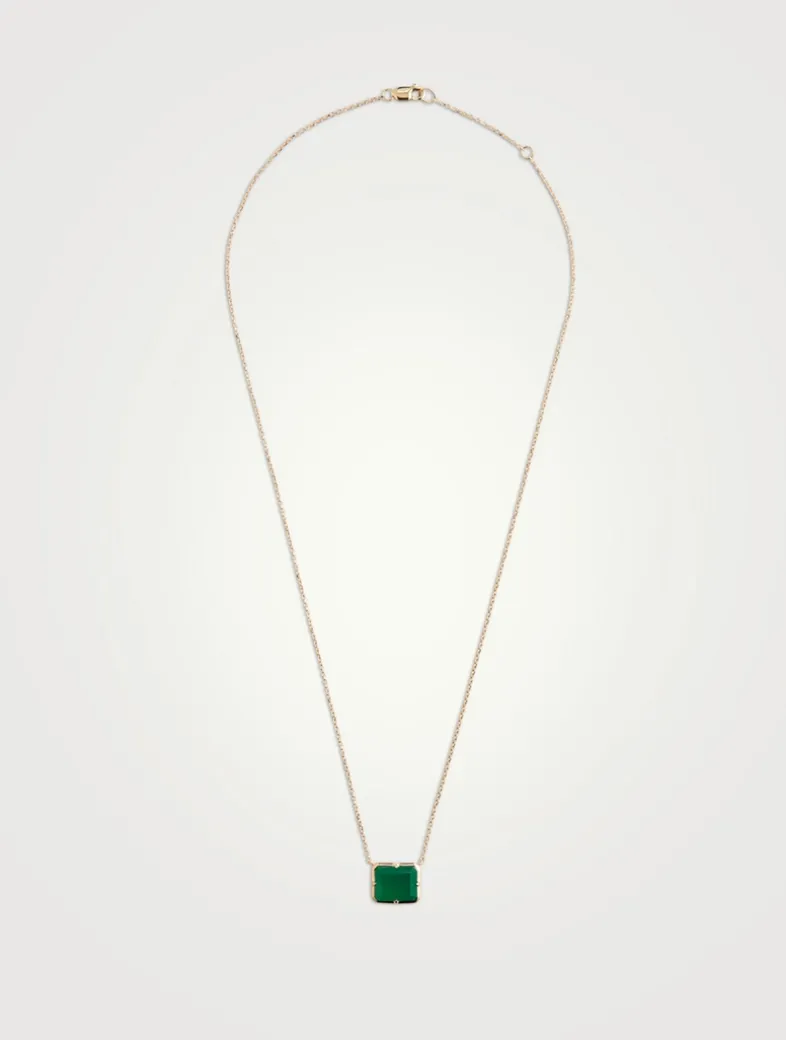 Designed with a dainty diamond cut chain, this necklace displays a glowing baguette cut gemstone mounted in a gold emerald-shaped setting.