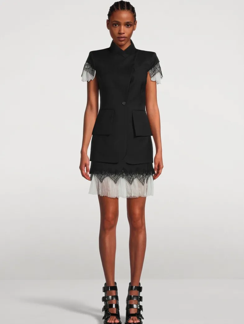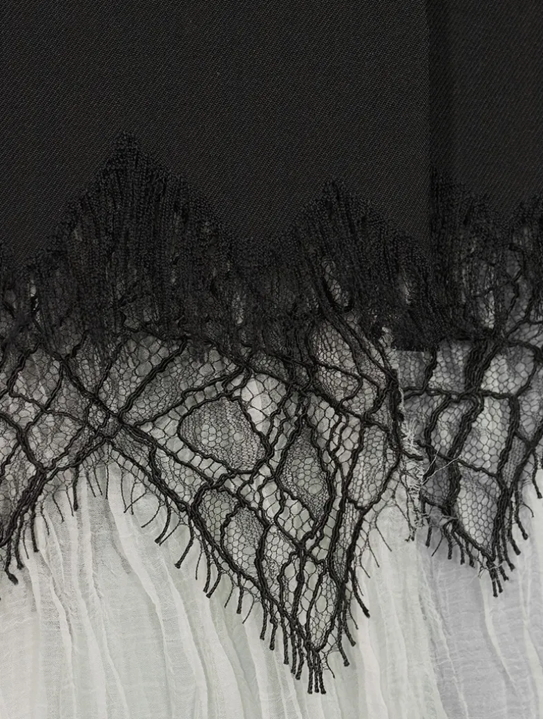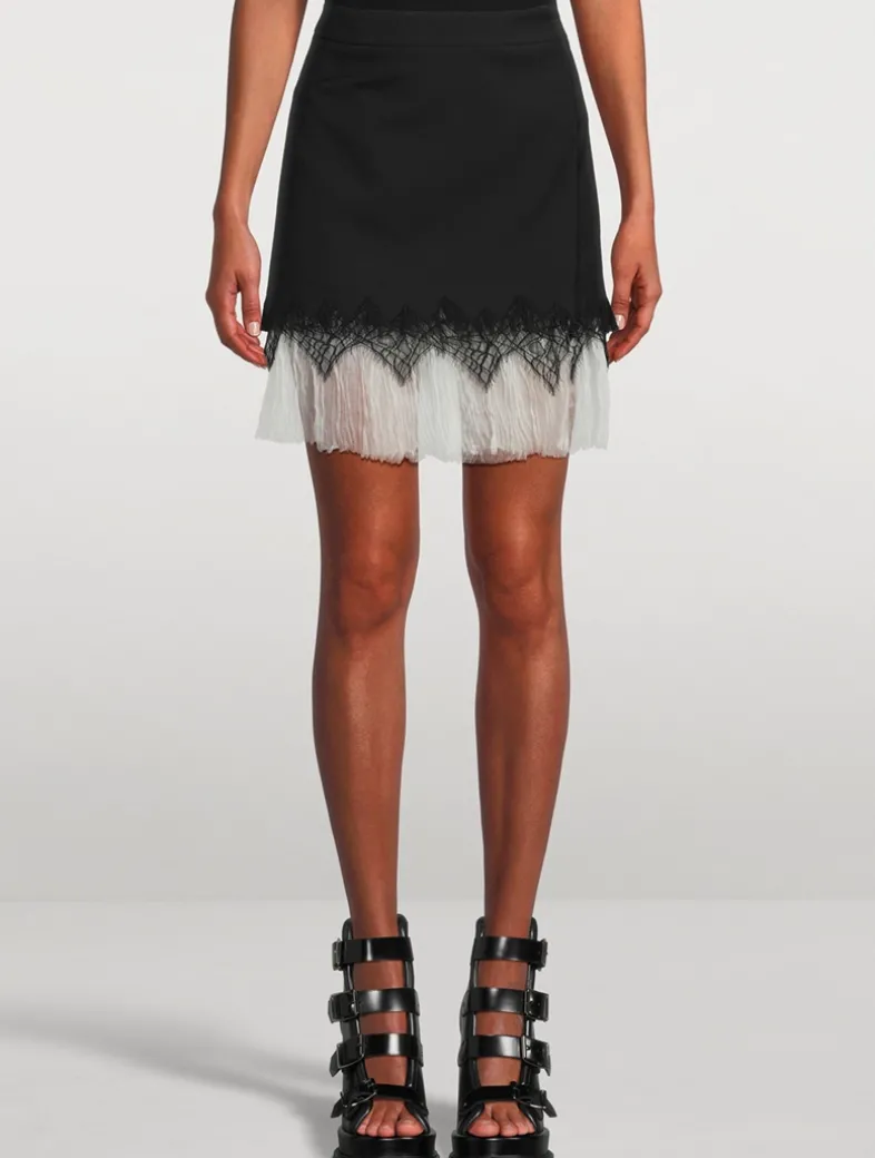 This mini skirt is crafted in certified Japanese wool gabardine embellished with delicate cobweb lace and silk plissé crepon trims at the hem. Finished with a concealed side fastening.