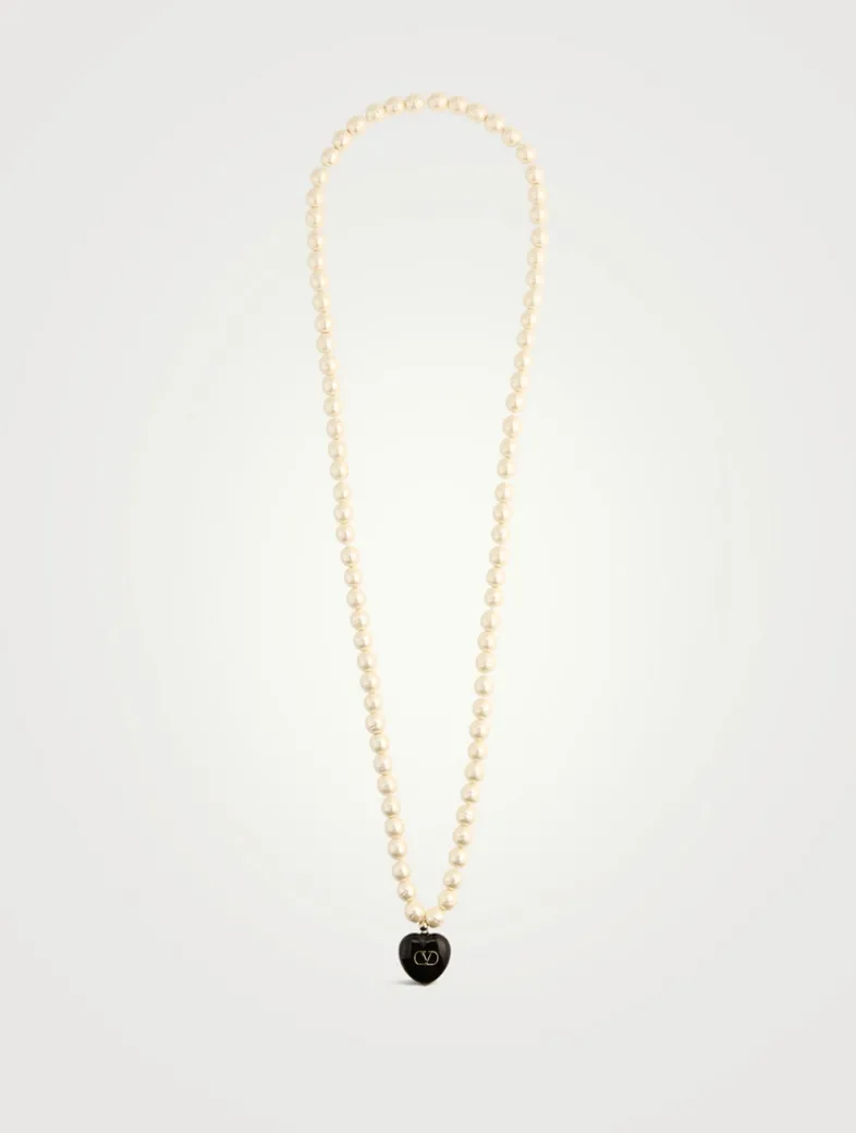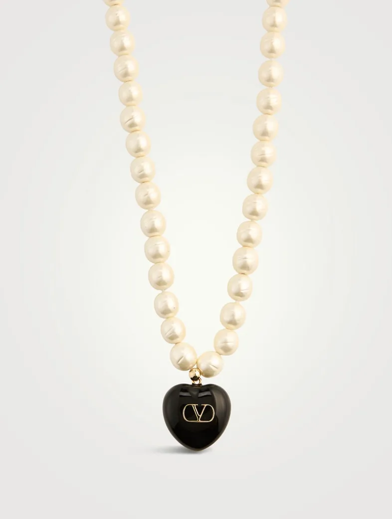 Strung with Baroque glass pearls, this necklace features a round enamel heart pendant with metal VLogo Signature detail.