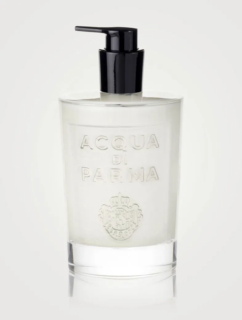 The Colonia Hand Lotion, a moisturizing formula scented with the iconic notes of Colonia, is presented in an elegant Art Deco-inspired glass bottle featuring the Acqua di Parma emblem.