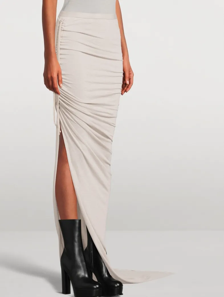 With a trailing floor length, this maxi skirt is detailed with an elasticized waistband, and a tight fit. It drapes and wraps around the hips, and gathers into a seam on the right thigh. Featuring a side split that can be modified using the drawstring, this long skirt is finished with a train that tapers to a narrow, floor trailing tip. This mediumweight and fluid viscose and wool blend jersey has a soft, warm hand feel and a slightly hairy surface texture.