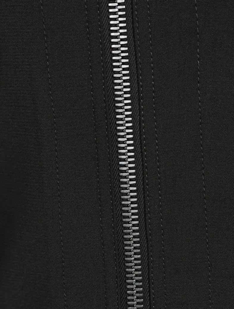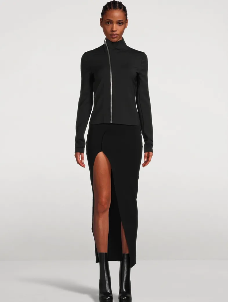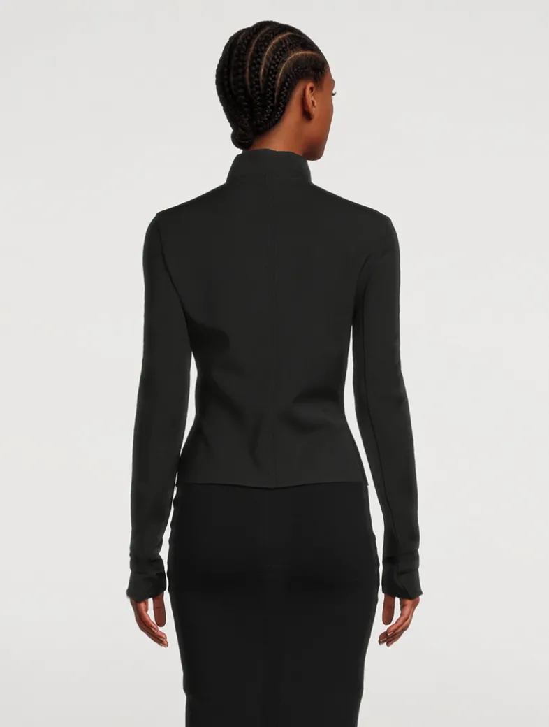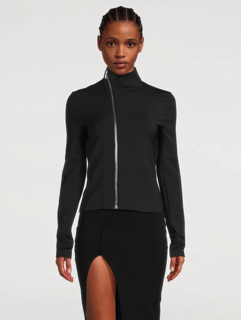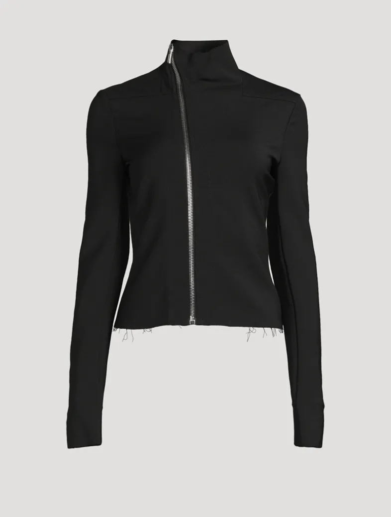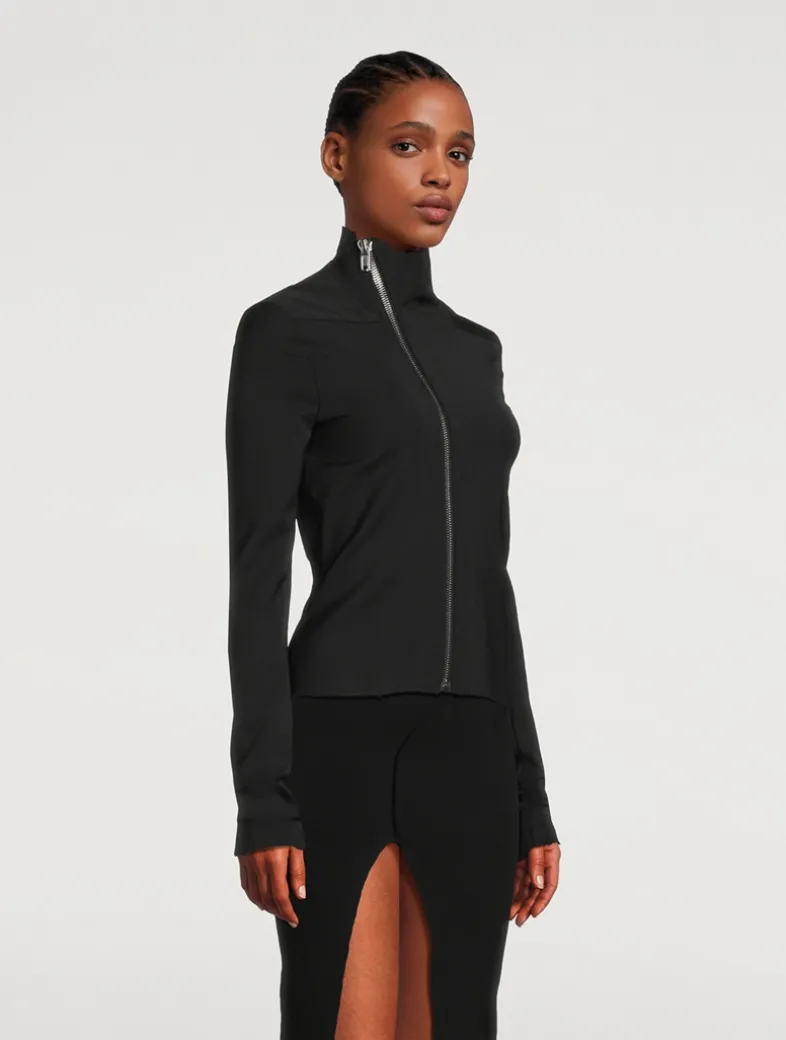 This jacket has long sleeves, a high neckline with an asymmetrical zip front opening, and level shoulder seams with topstitching. It is crafted from a mediumweight stretch wool fabric with a double satin weave with a soft handfeel.