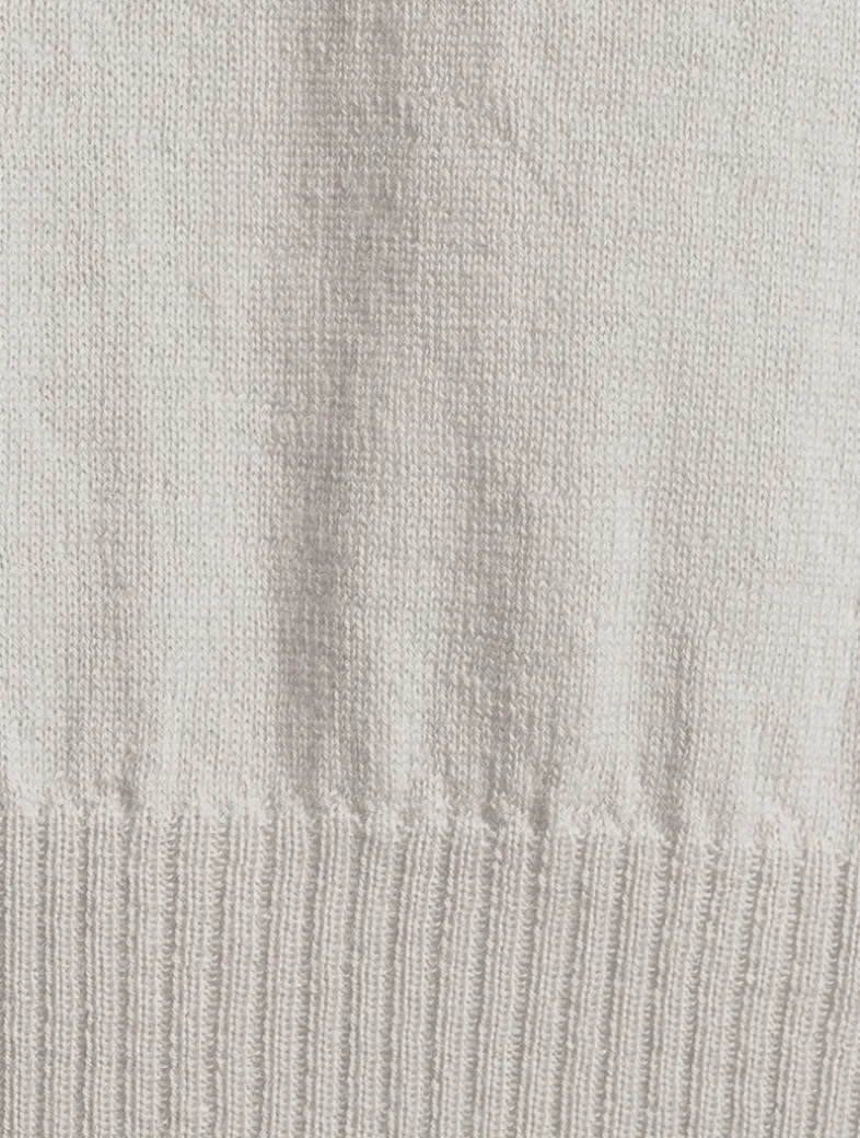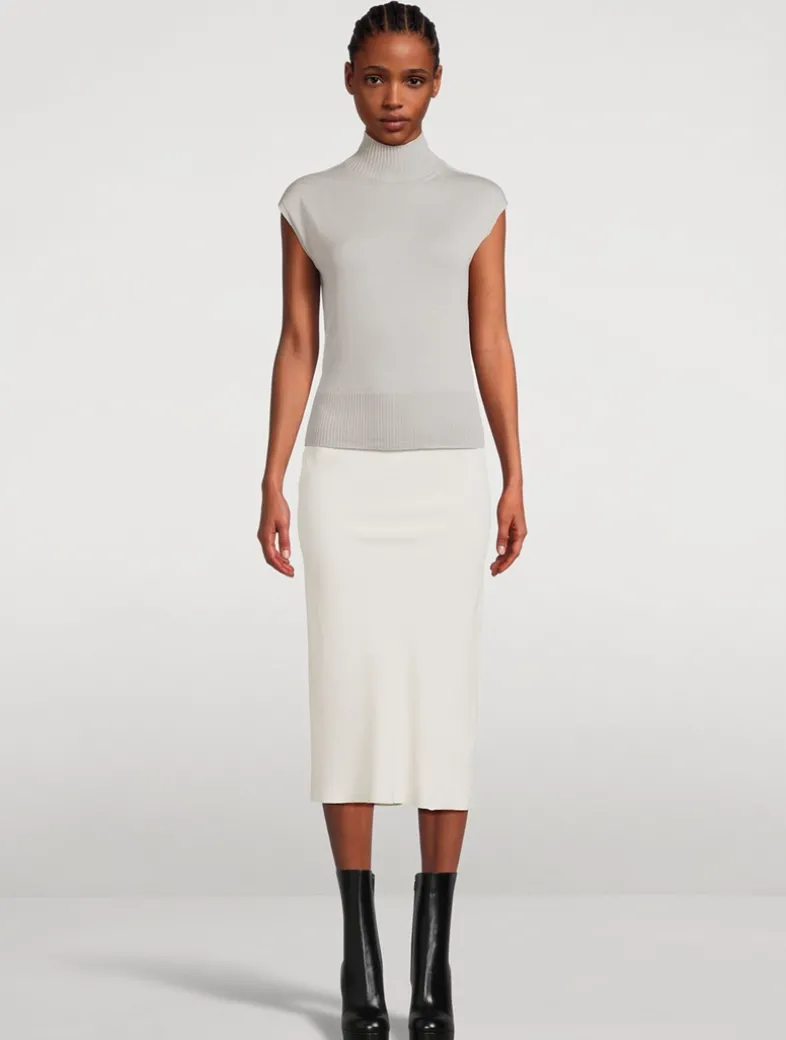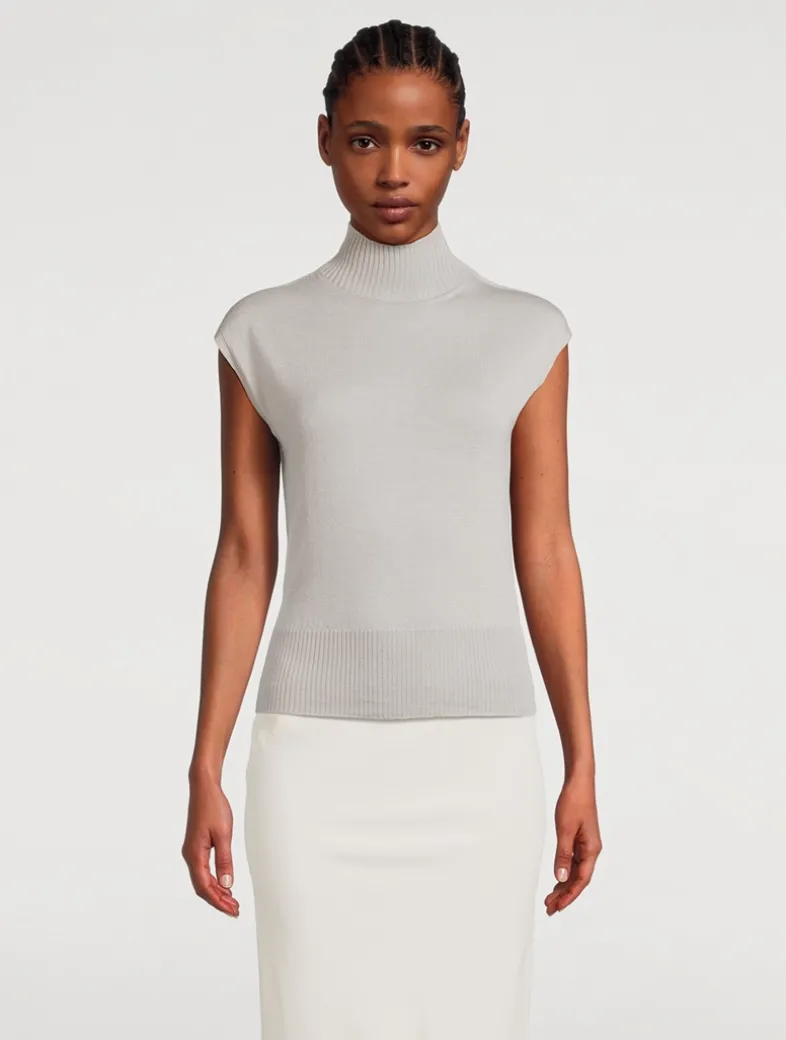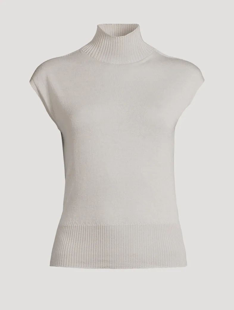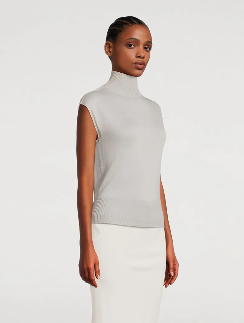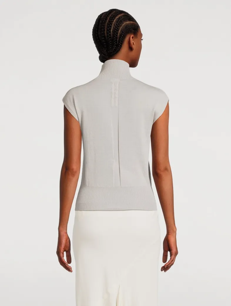 This turtleneck has wide shoulders and is sleeveless. It has a ribbed collar and wide ribbed waistband, and the signature knit channel running down the centre back spine. Made from a lightweight and classic wool knit that has a soft handfeel.