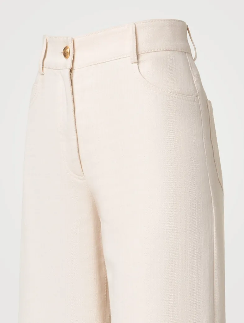 An elevated take on denim, these pants are made from a cotton and wool blend with a hint of stretch. They have a high-rise waist, relaxed legs, and a classic five-pocket design.