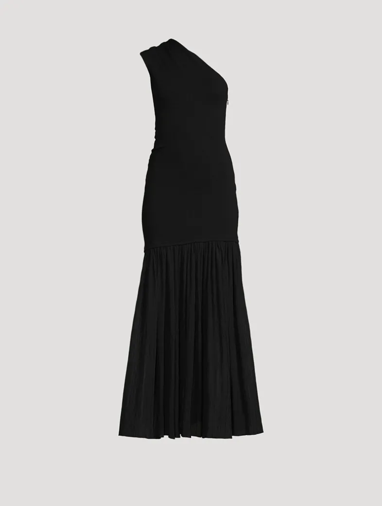 The Cora, crafted in pleated crêpe chiffon, is cut to a slim, ankle-length silhouette. Detailed with a knit one-shoulder bodice contrasted by a textural sheer pleated skirt.