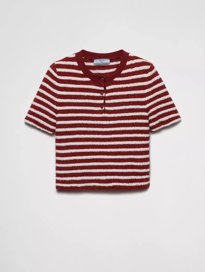 Short sleeves Striped knit Boxy fit Ribbed knit crew neck Regular shoulder Knit triangle logo Front-button closure