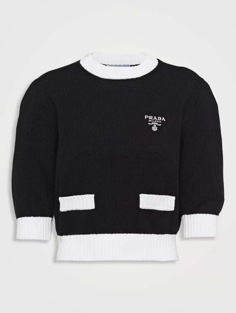 Plain stitch knit Cropped fit Ribbed knit collar Saddle shoulder Short sleeves Ribbed knit sleeve trim and hem Embroidered logo
