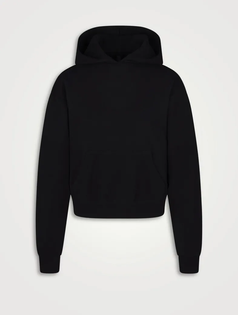 Your lounge collection isn’t complete without this classic pullover hoodie made with SKIMS’ softest fleece fabric and updated with a slightly longer length and more open neckline. Features front kangaroo pockets, a double-lined hood, and a ribbed waistband and cuffs. Fits true to size.