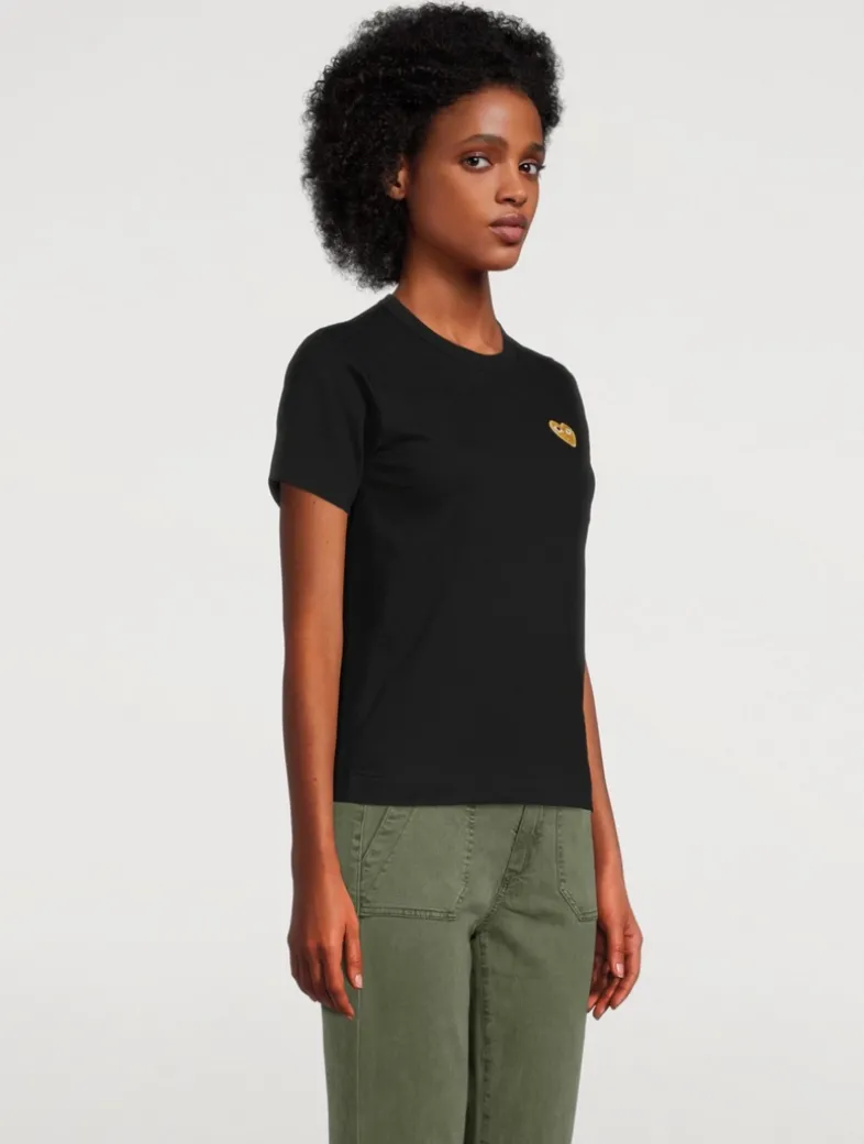 Crewneck T-shirt with signature COMME DES GARCONS embroidered heart patch at chest.