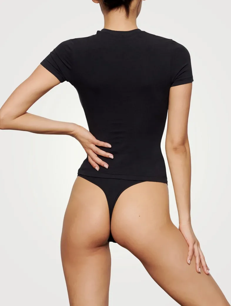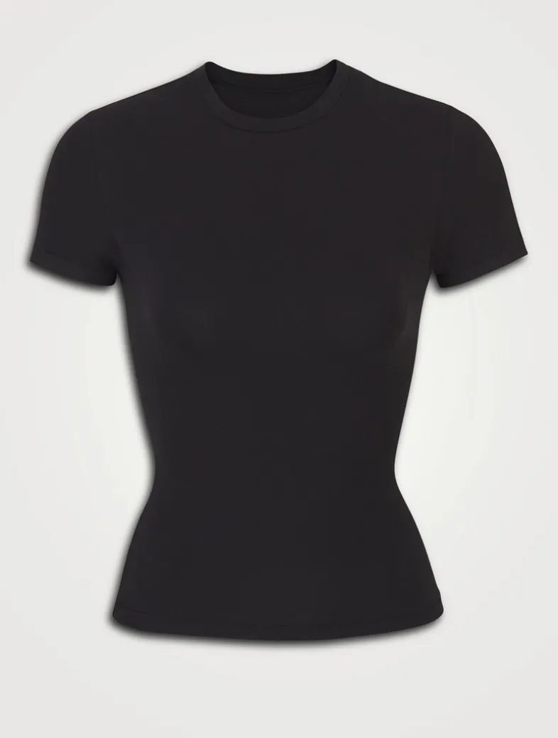 SKIMS’ viral T-shirt in the cotton everyone craves. This perfect five-star tee is made with stretchy, lightweight cotton that enhances your curves with its body-hugging fit and elevates your comfort with its incredibly soft feel. Features stitching details along the short sleeves and hem and hits below the natural waist. Fits true to size.