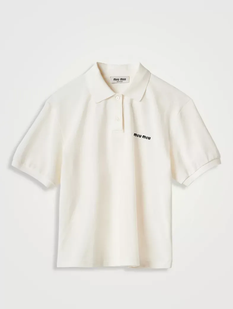 Boxy fit Polo-style collar Front button closure Short sleeves Embroidered logo Long slits on the sides Twin needle hem