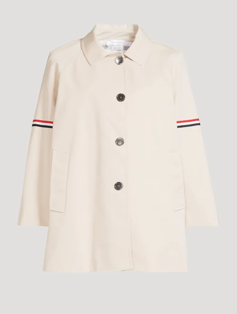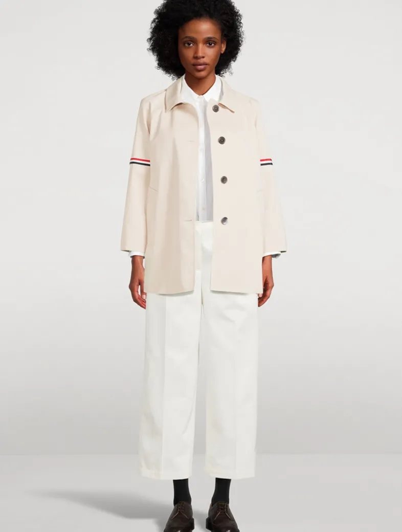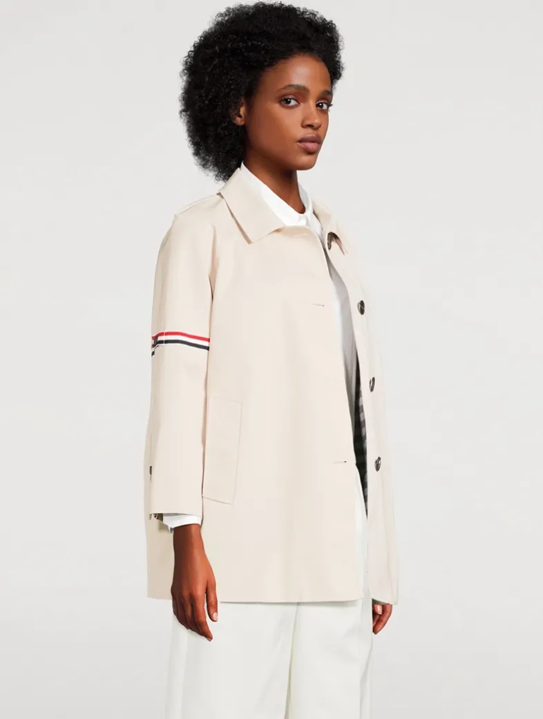 This cropped car coat is made in waterproof cotton twill with striped grosgrain armbands. It has cropped sleeves with buttoned cuffs and striped grosgrain trim. Finished with a gingham lining with an interior pocket and name tag.
