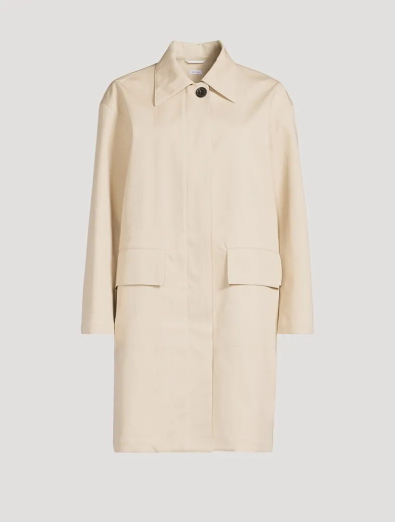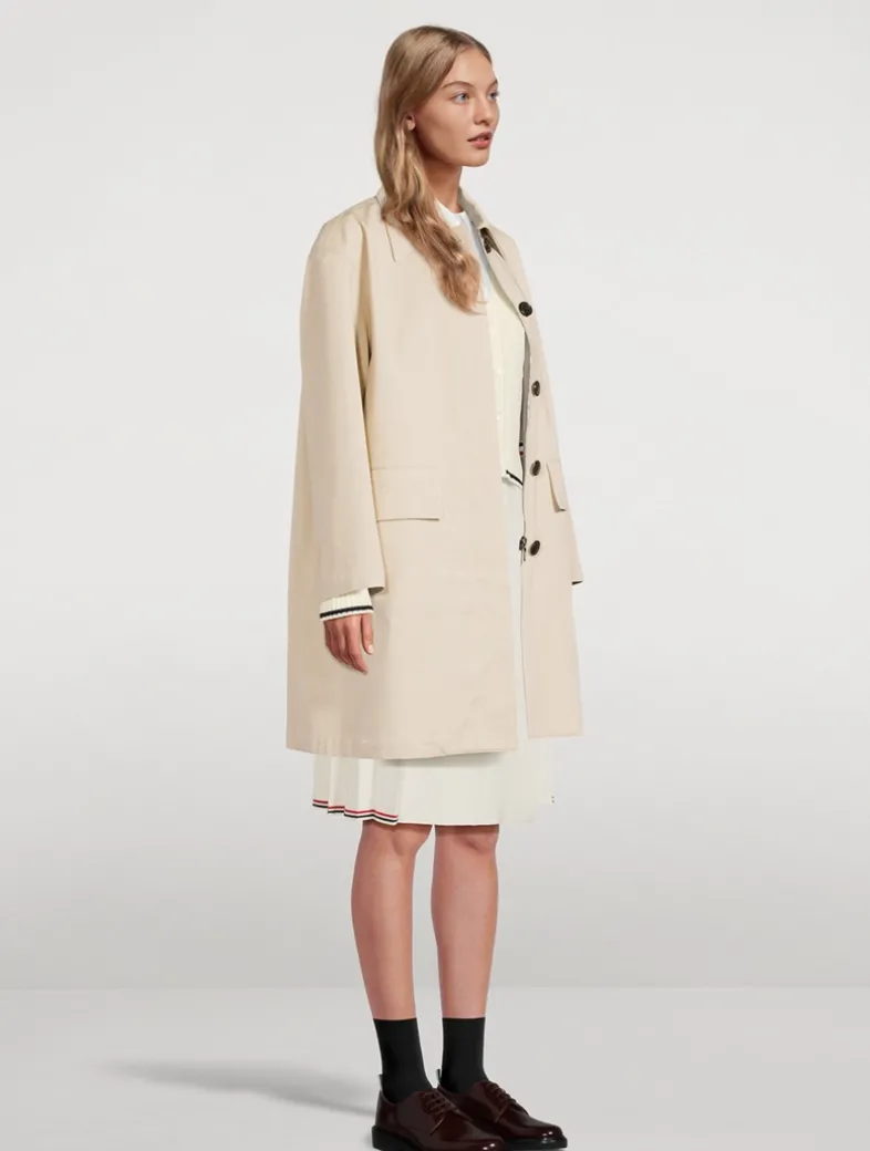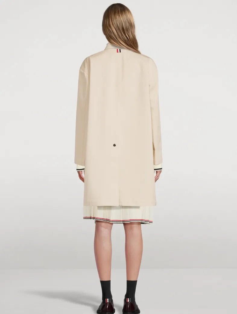 A waterproof finish lends a functional touch to this topper. Crafted from a crisp cotton twill, it has a concealed button and zipper placket with flap pockets at the waist.