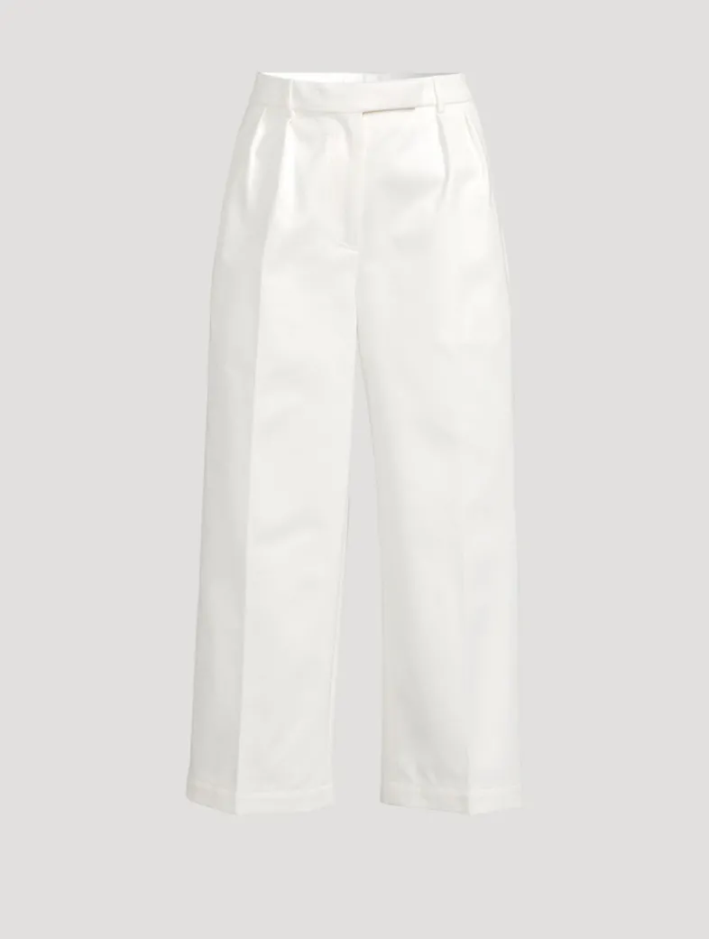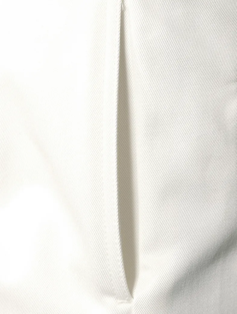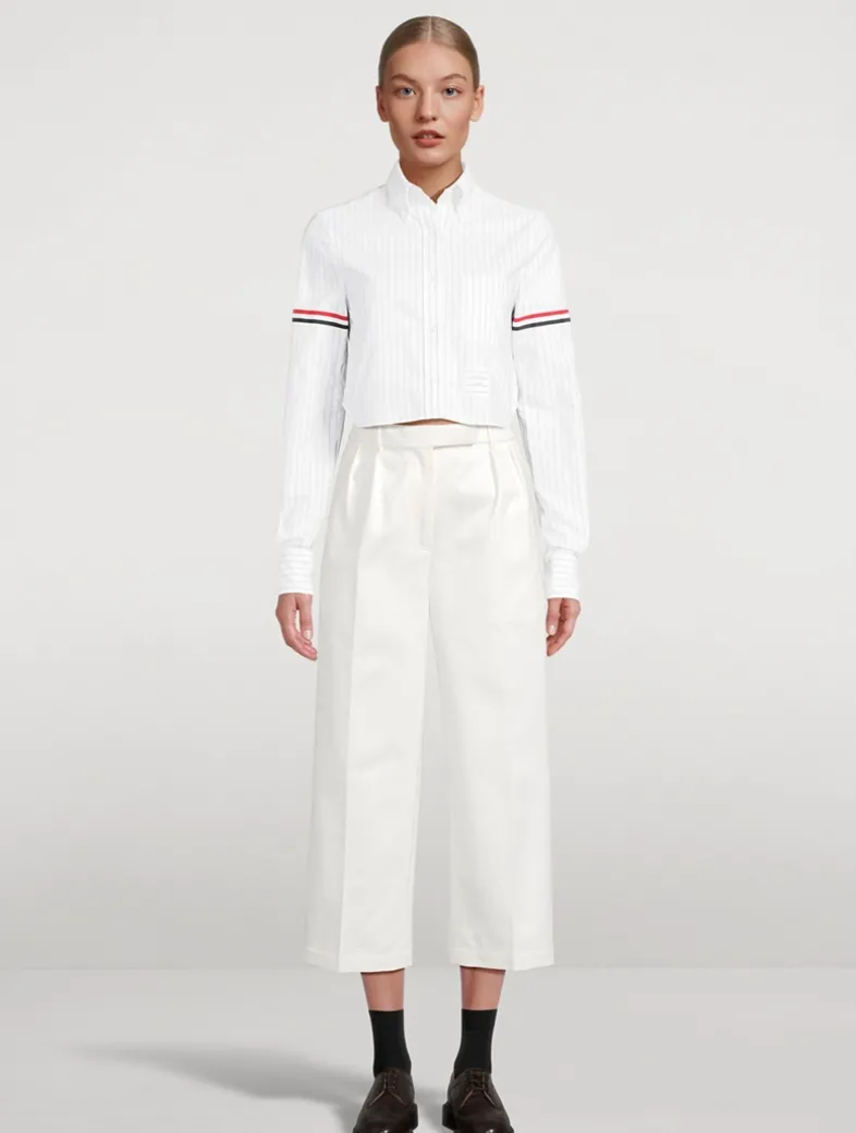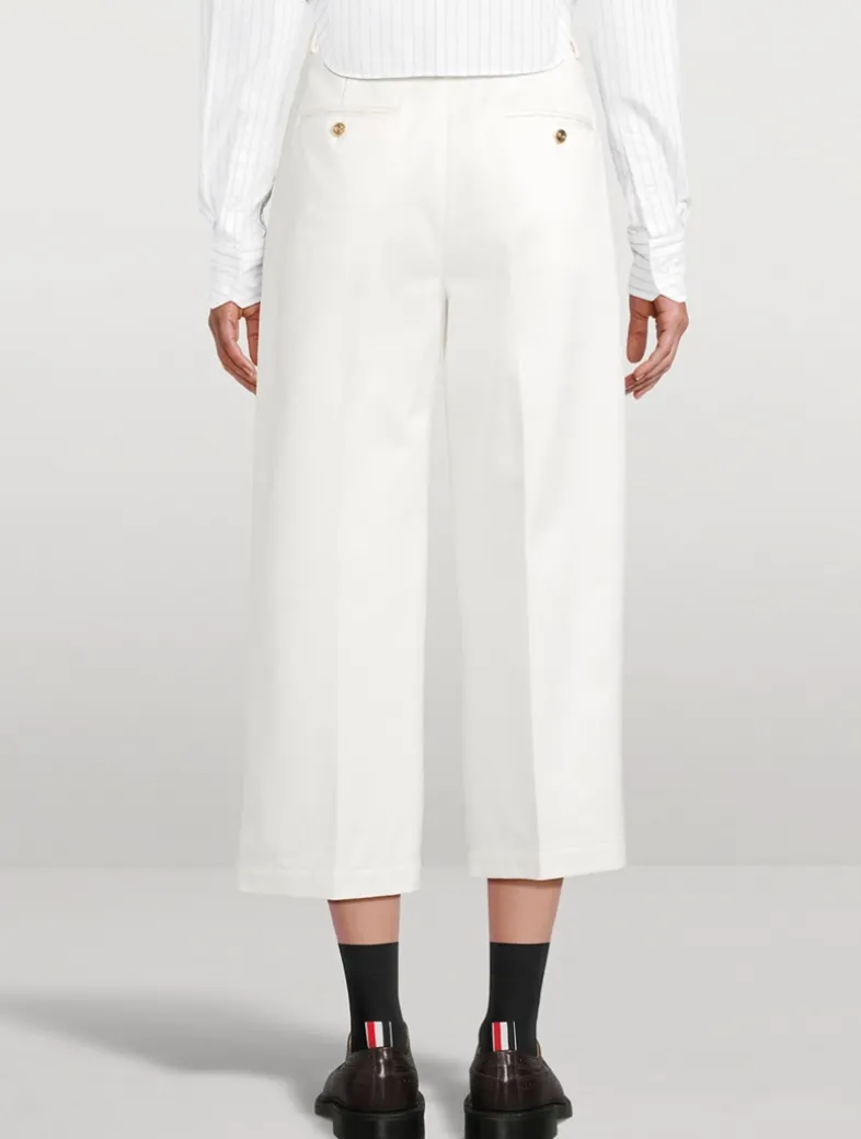 These trousers are crafted from a cotton twill with side slip pockets and buttoned rear pockets. A shortened hem pays homage to Thom Browne’s distinguished tailoring.