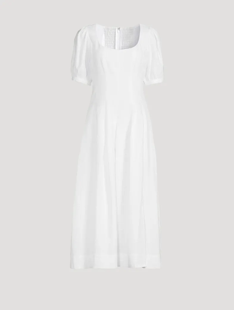 This midi has a tailored bodice with a flattering scoop neckline and short sleeves with gathered shoulders and banded cuffs. Crafted from an organic cotton blend, it has smocking at the back and a slit at the skirt. Bluesign® certified.