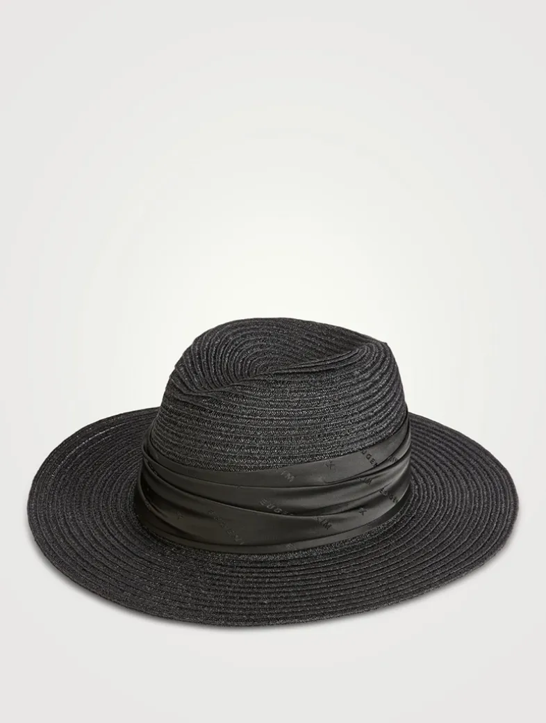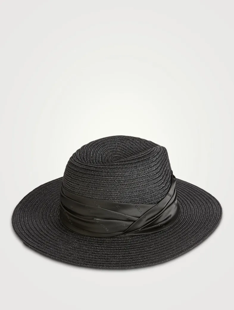 Crafted from a vented breathable hemp-cotton weave, this packable sun hat features a black logo jacquard satin ruched band.