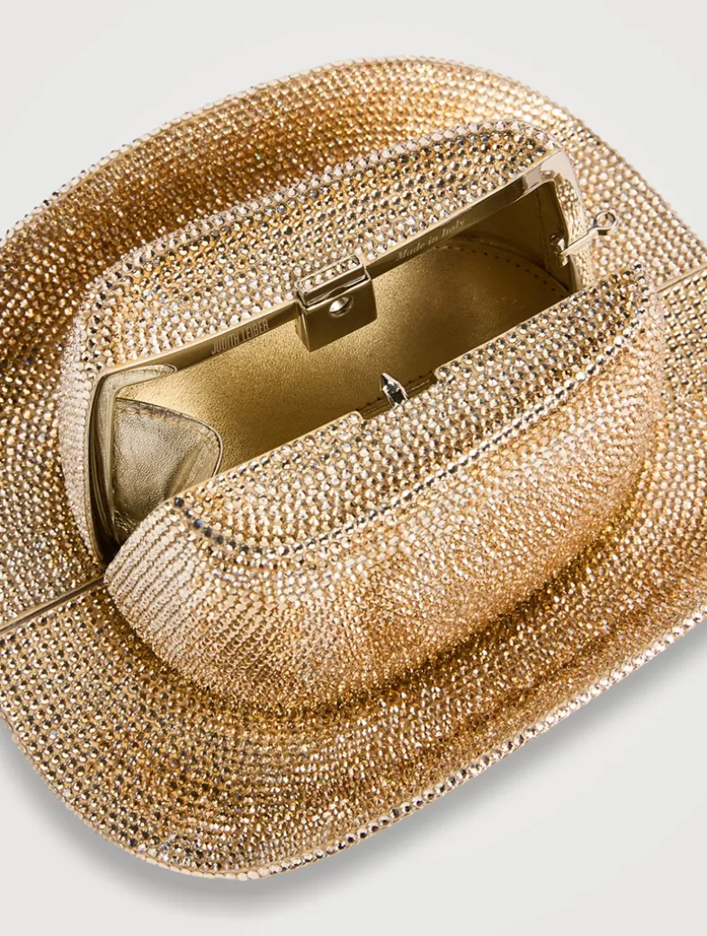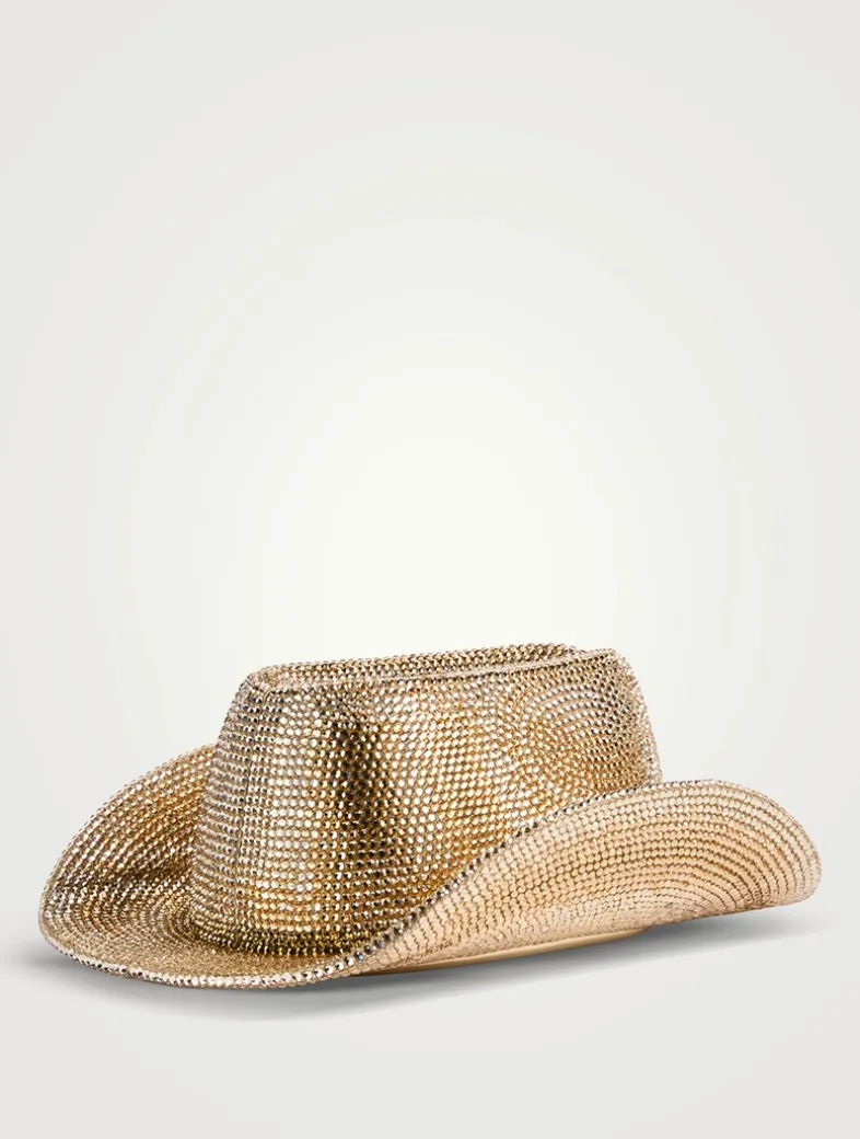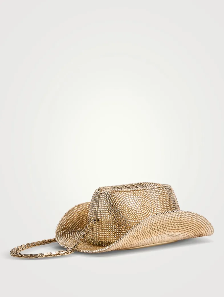 Be the star of your own Western with the Cowboy Hat Cheyenne. Adorned with dazzling crystals, this handbag has a removable cable-link wristlet and a removable continuous crossbody chain.