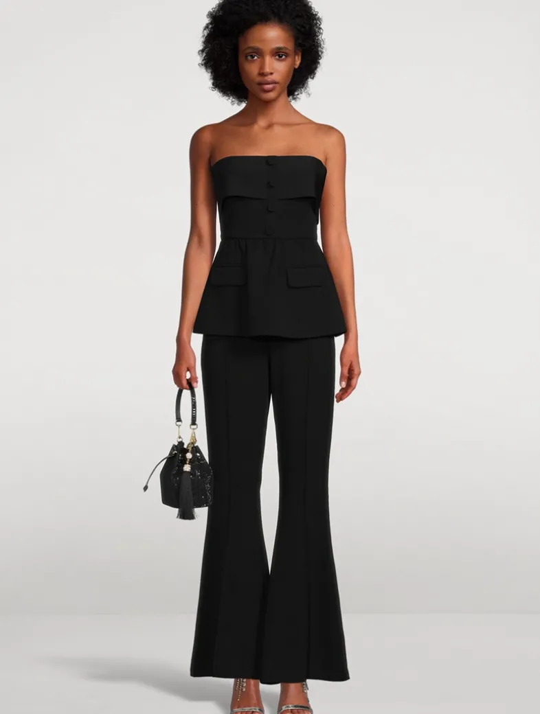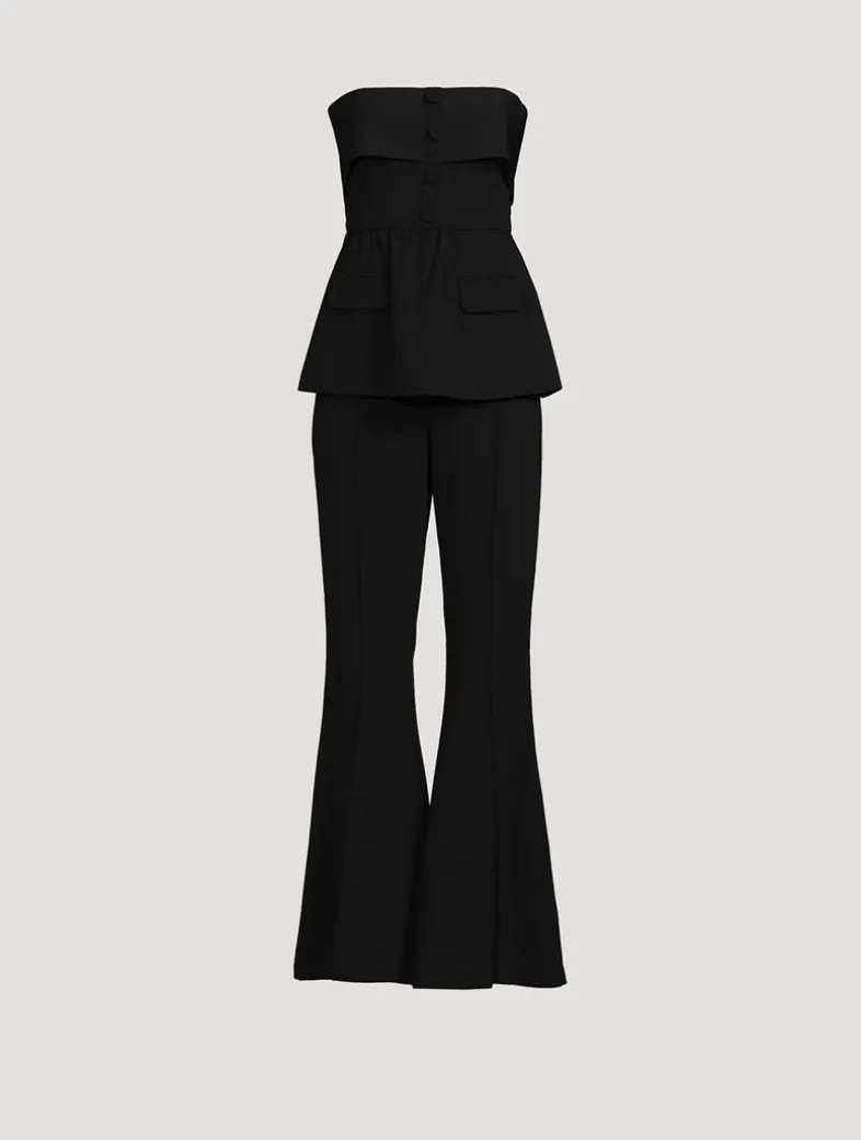 Cut from stretch crêpe with a buttery-smooth finish, this flared jumpsuit was designed to cinch and accentuate in all the right places with its flattering peplum waist. Complete with an internal corset, faux button embellishment, and a concealed zip closure at the back of the bodice.
