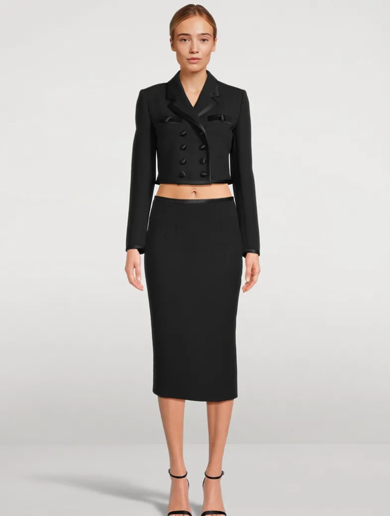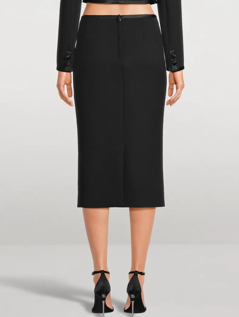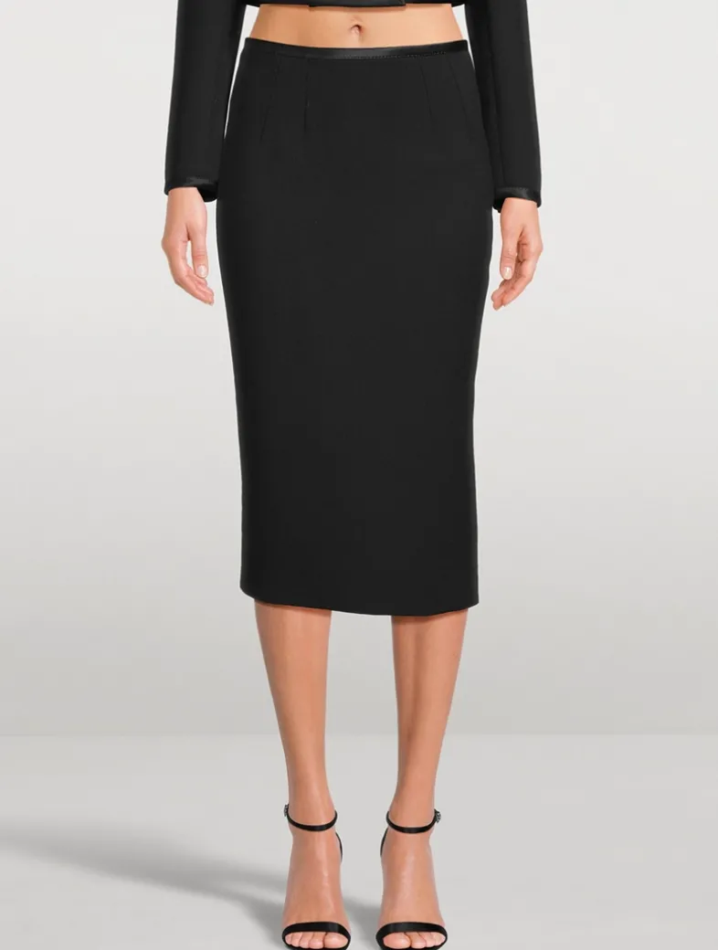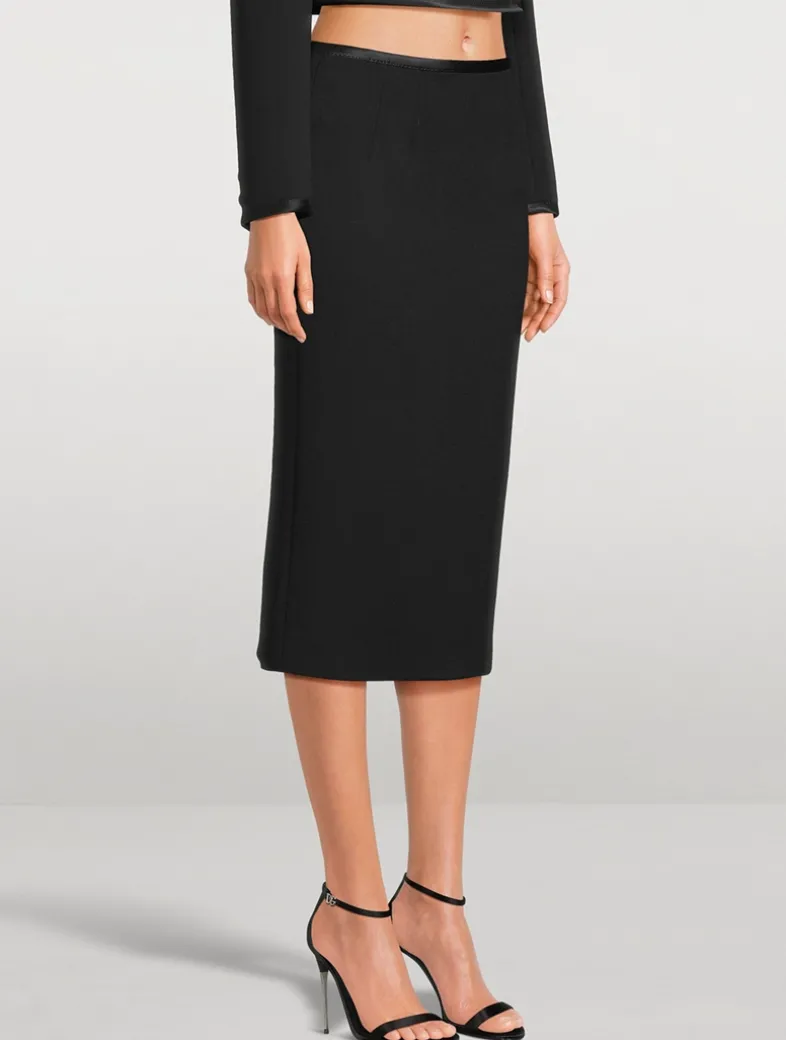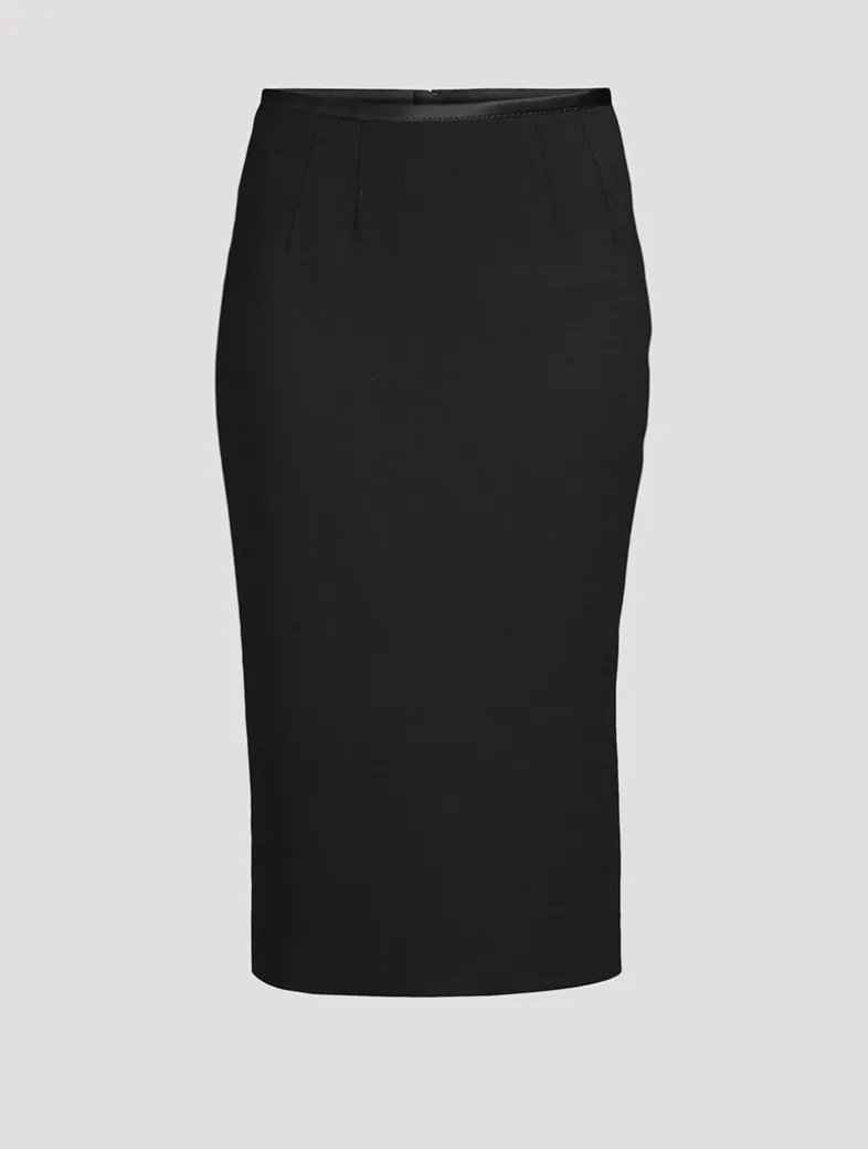 Crafted from a wool-blend crêpe edged with tonal satin trim, this midi has a slim fit with a below-knee length. The pencil skirt is finished with a hidden zipper at the back.