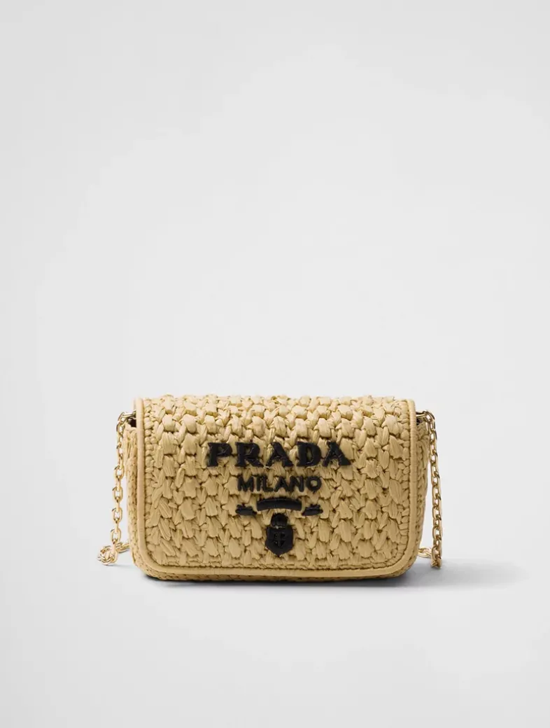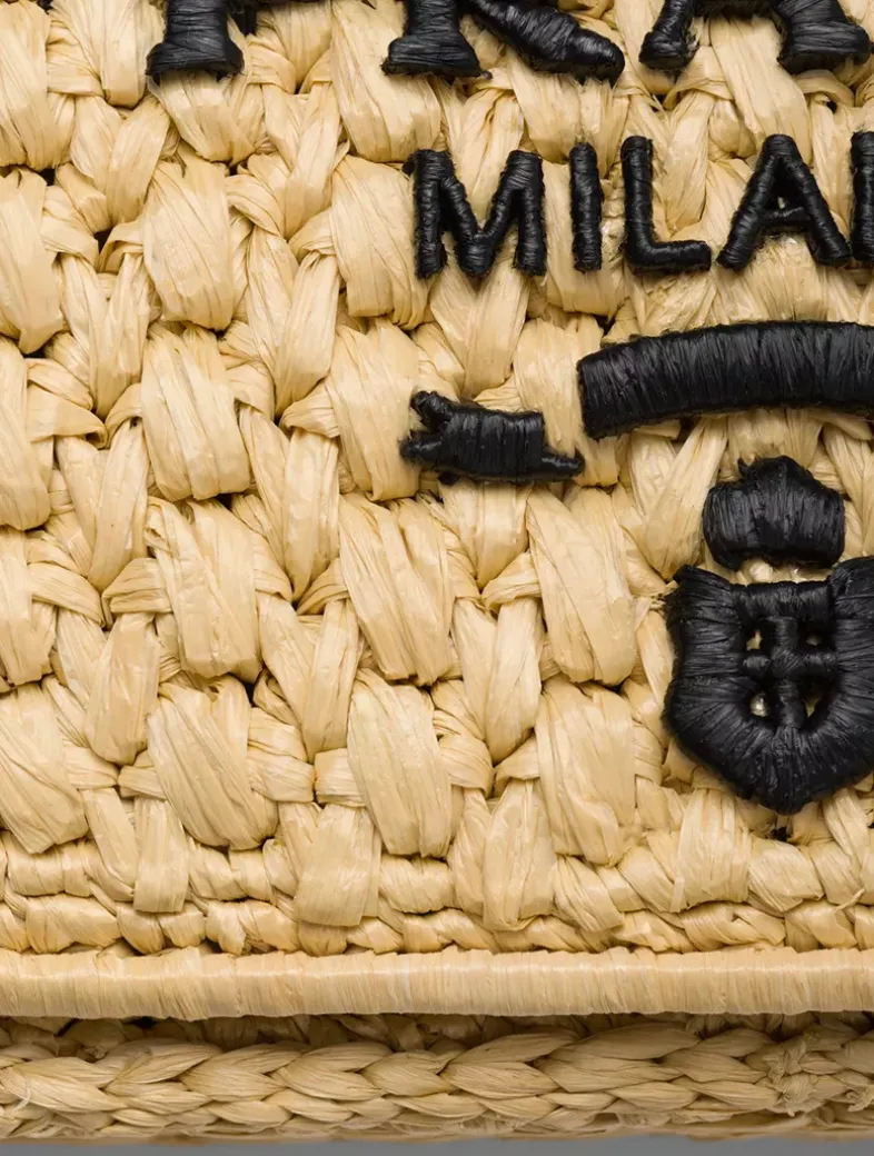 Raffia-effect yarn Chain shoulder strap. Length 110 cm – Drop 52 Metal hardware Embroidered logo on the front and enameled metal triangle logo on the back Magnetic closure with flap Nappa leather interior with patch pocket