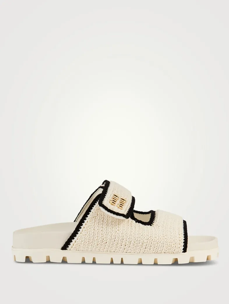 A traditional look, summery style, and the fine craftsmanship of cotton crochet characterizes these slides. Set on a treaded rubber sole with a molded footbed for added comfort. The Miu Miu logo completes the design with an iconic note.