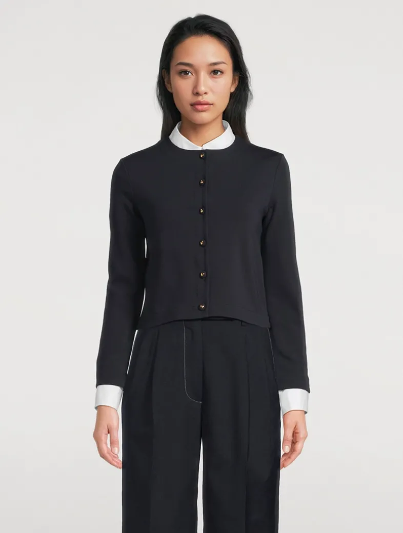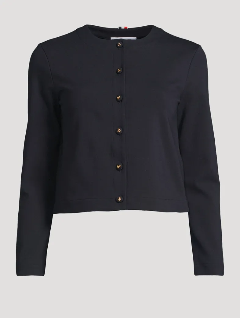 Cut to a slightly cropped silhouette with bracelet-length sleeves, this crewneck cardi is embellished with anchor-embossed buttons at the placket.
