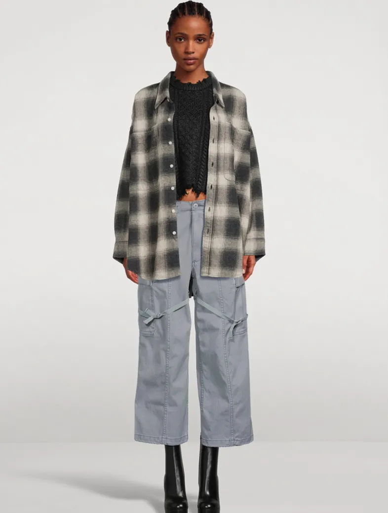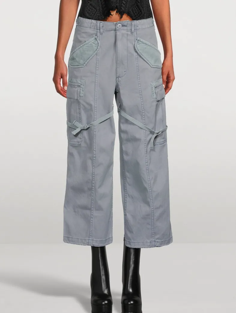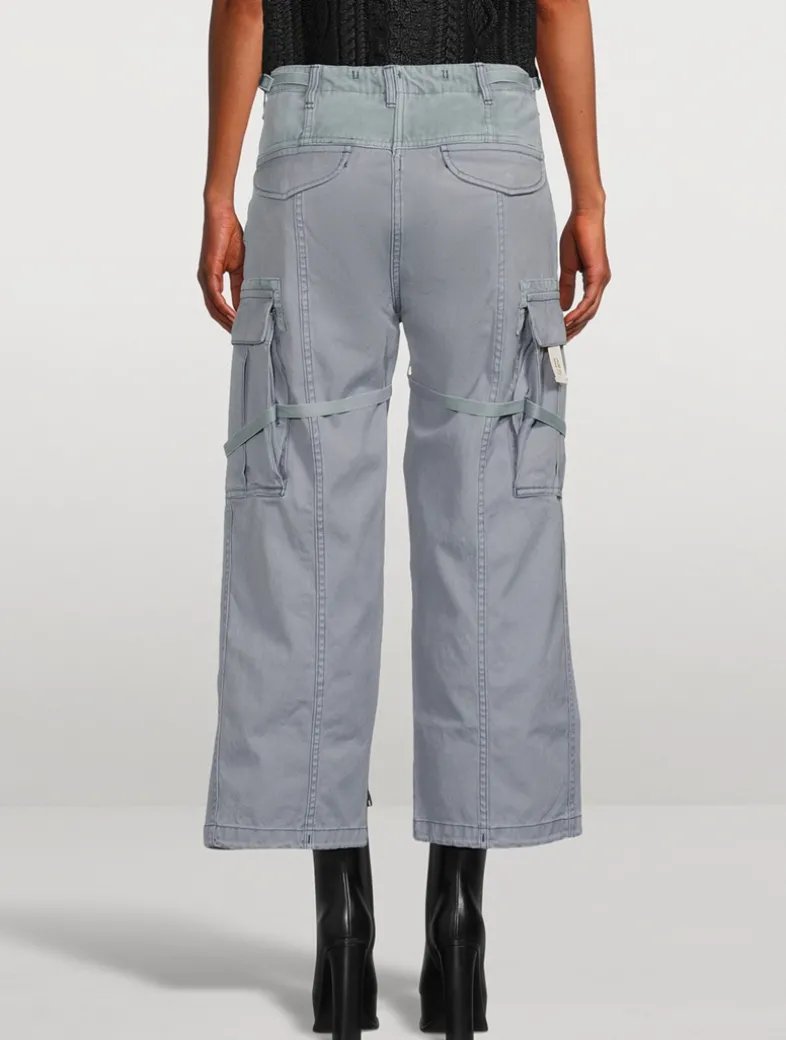 Constructed from faded Japanese canvas and treated with a simple garment wash, these cargo pants are cut to an ankle length with a wide-leg silhouette. The style features extra seaming details on the front and back legs, along with corduroy contrast blocks on the pockets and upper back. Finished with belt loops and multiple pockets at the front and back, this design offers both chic style and functionality.