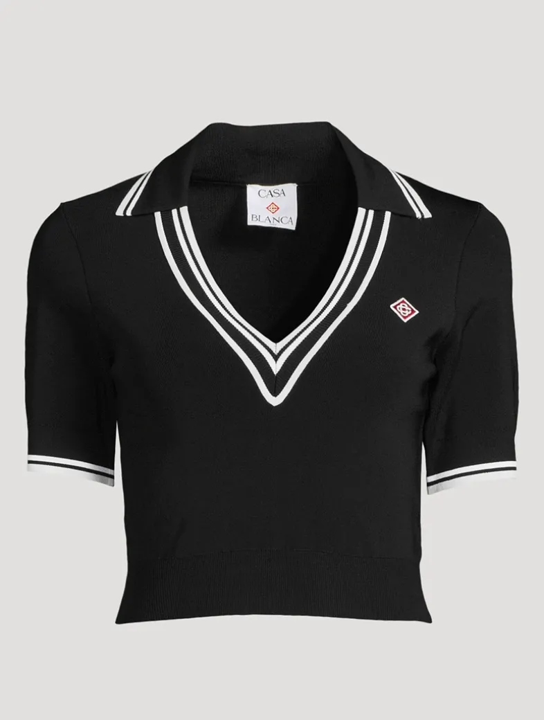 This V-neck polo shirt is a cropped style crafted from a knit fabric featuring the house’s signature diamond logo. Completed with ribbed collar, cuffs, and hem with contrasting stripe details.