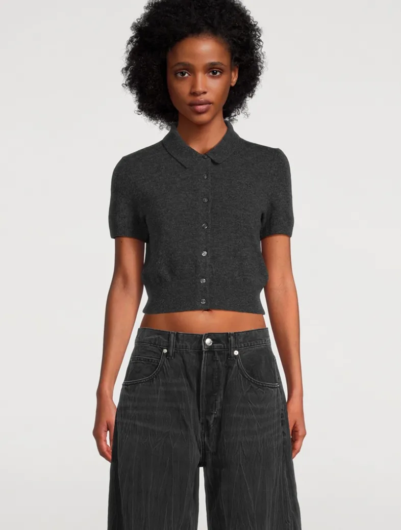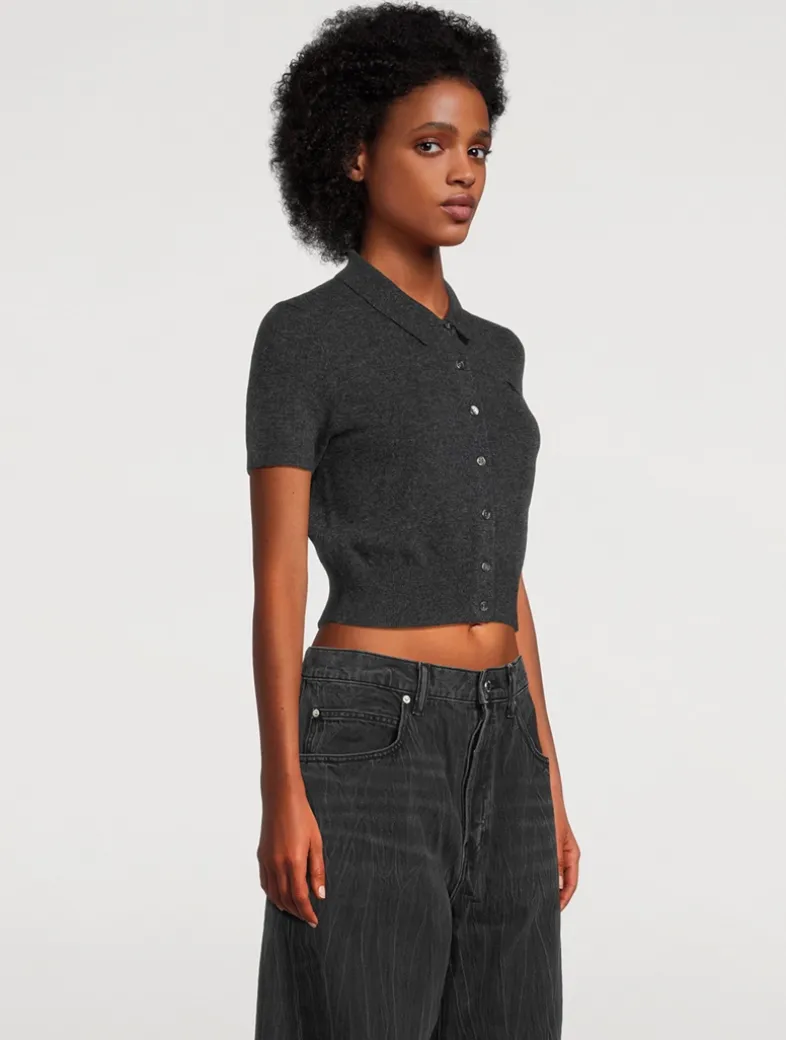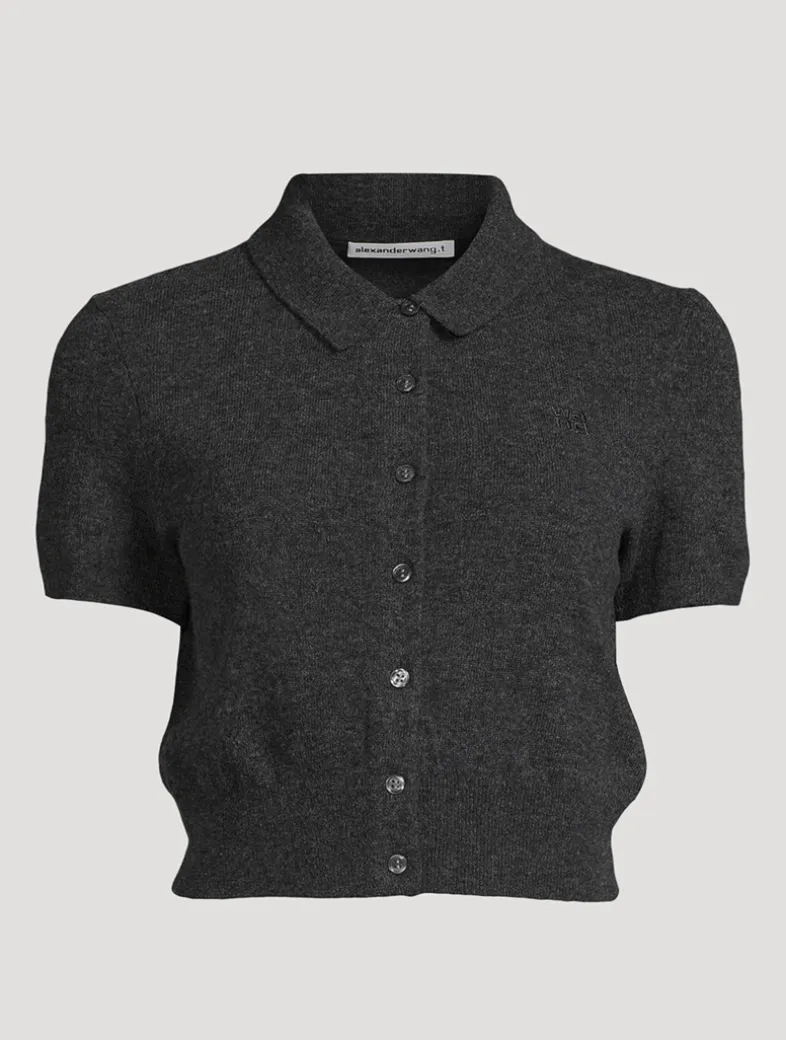 A high-frequency stacked logo defines this short-sleeve polo cardigan fastened with shell buttons and finished with ribbed edges. Knit from wool, it has a cropped length and stretch trim.