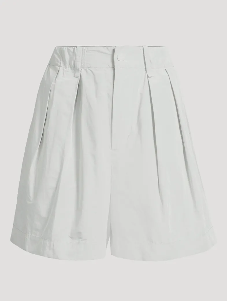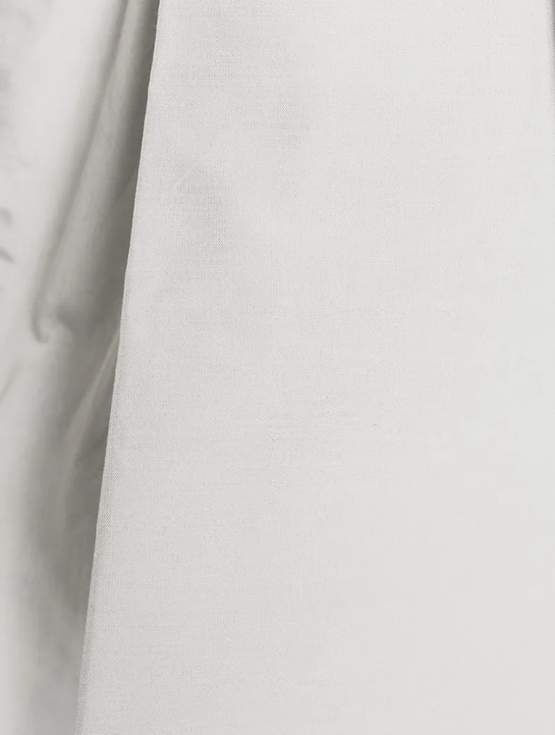 Crumpled U is a woven series characterised by its distinctive crumpled, paper-like texture. Crafted from raw polyester woven at high density without heat treatment, the fabric retains a natural firmness and shape-memory structure. Fine cotton yarns are integrated into the weft to provide a soft, comfortable feel against the skin. These shorts feature a voluminous shape with front darts, a partially elasticated waistband, and belt loops. They have a zip fly, side pockets, and back weft pockets.