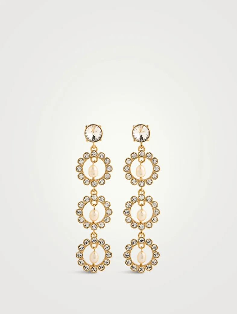 These glamorous drop earrings feature three stacked glass crystal discs, each with a delicate faux pearl at the centre, creating an elegant, cascading effect.