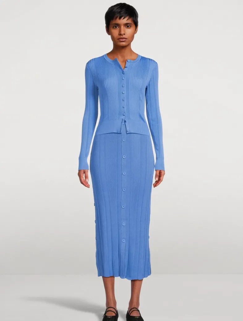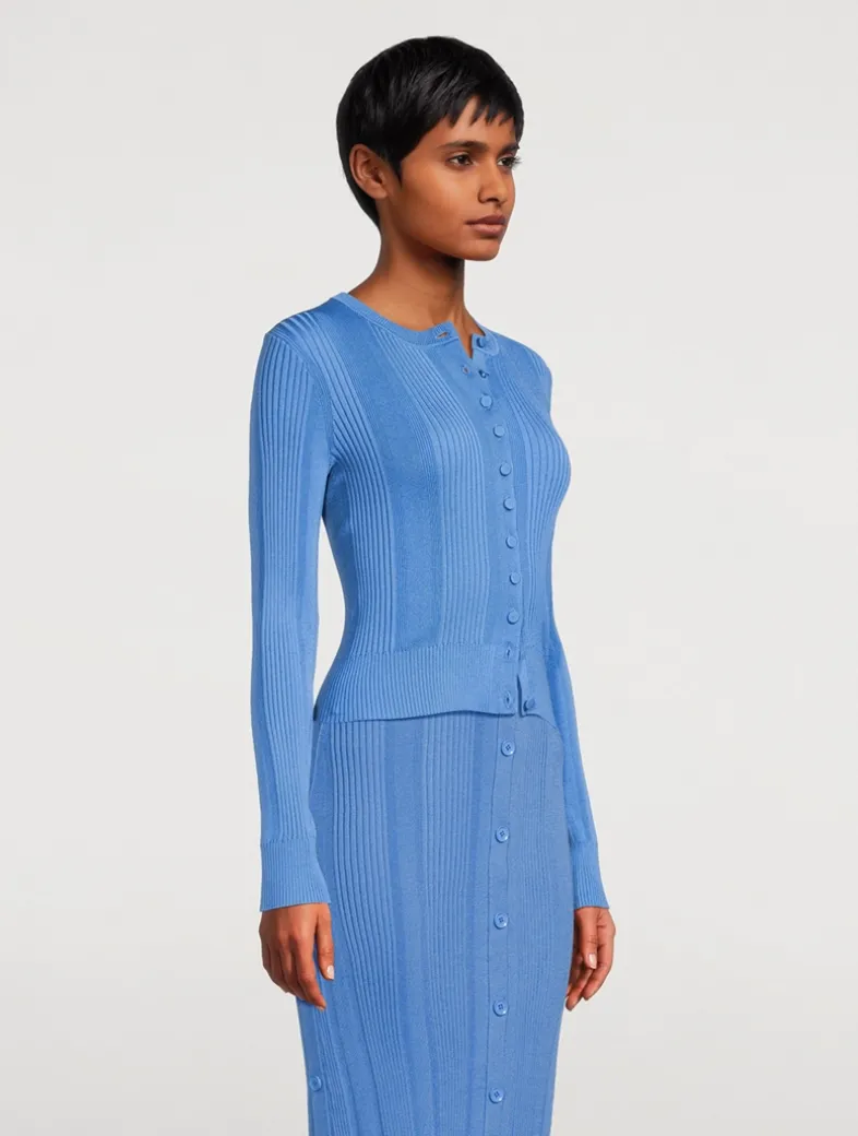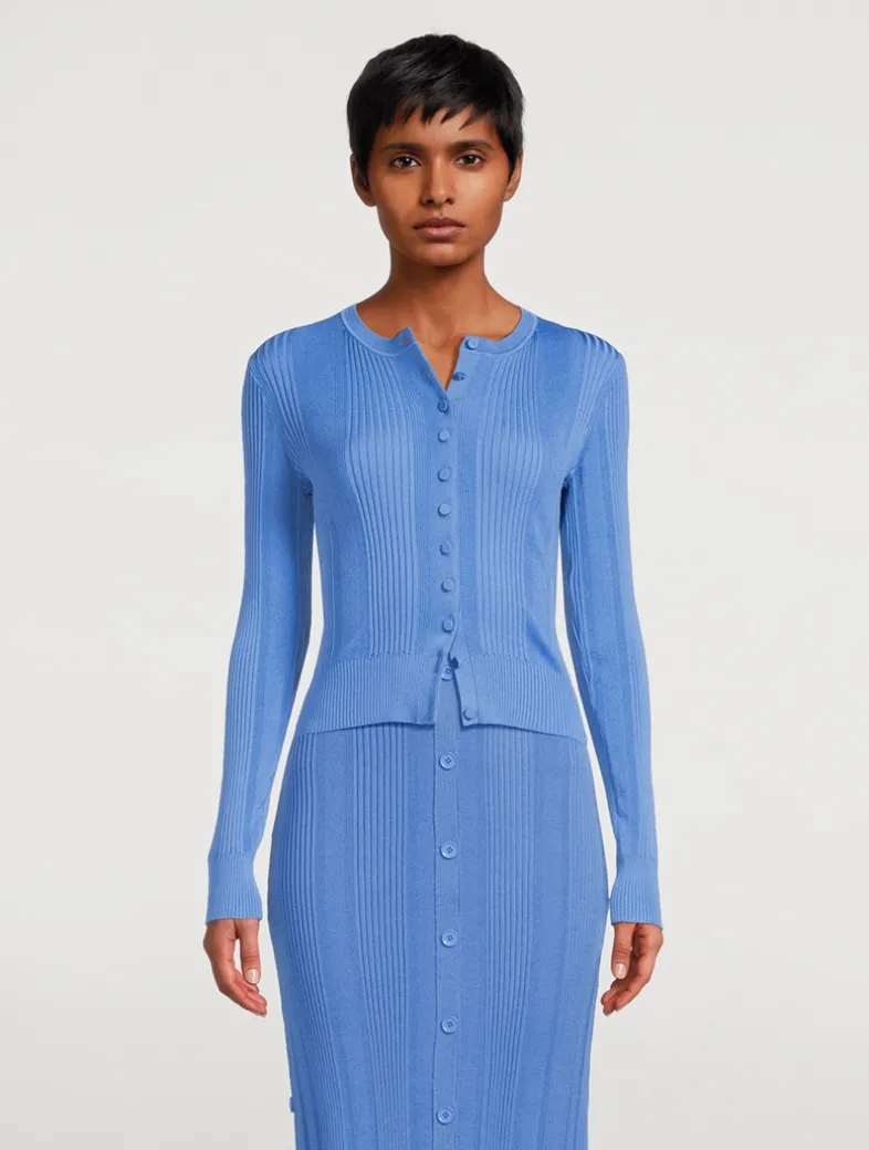 Cut to a curve-hugging silhouette, the Currin Cardigan is crafted from a lightweight knit textured with a column rib. It is accented with buttoned detailing along the center front.