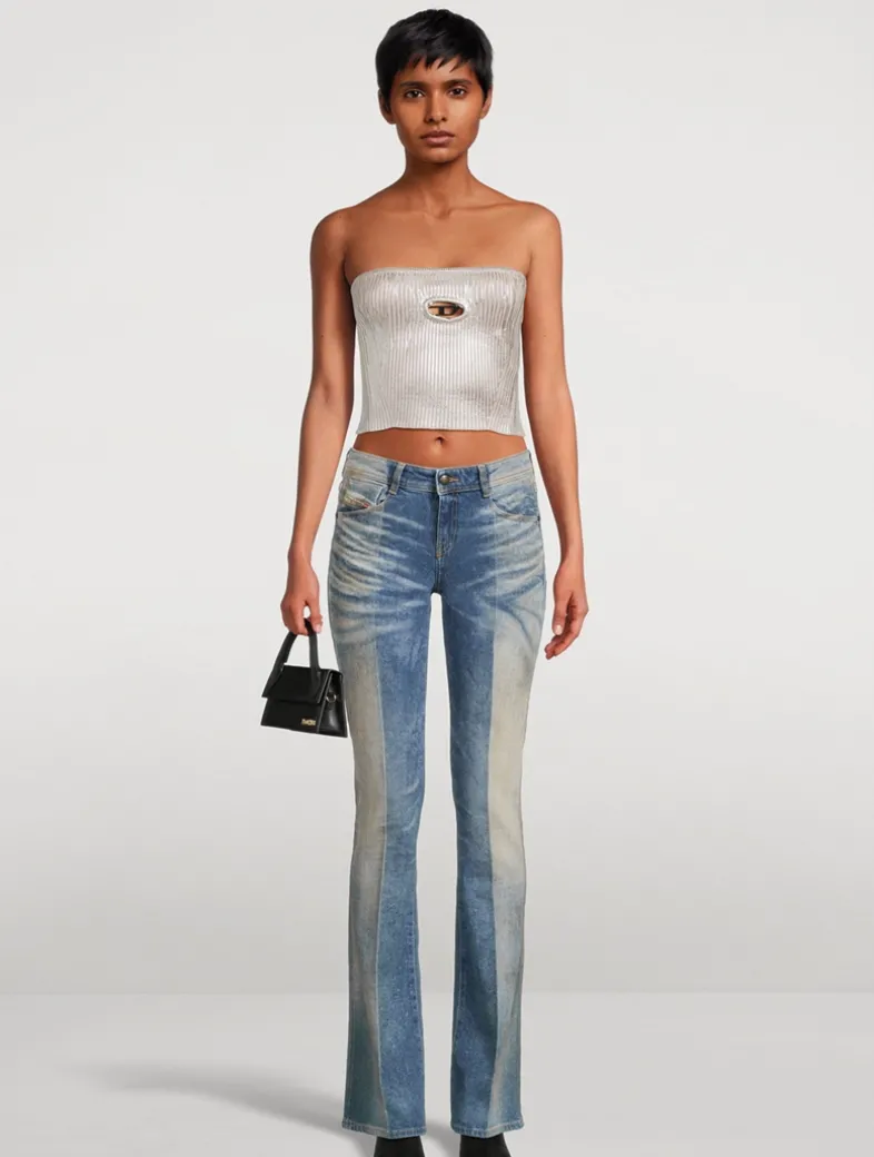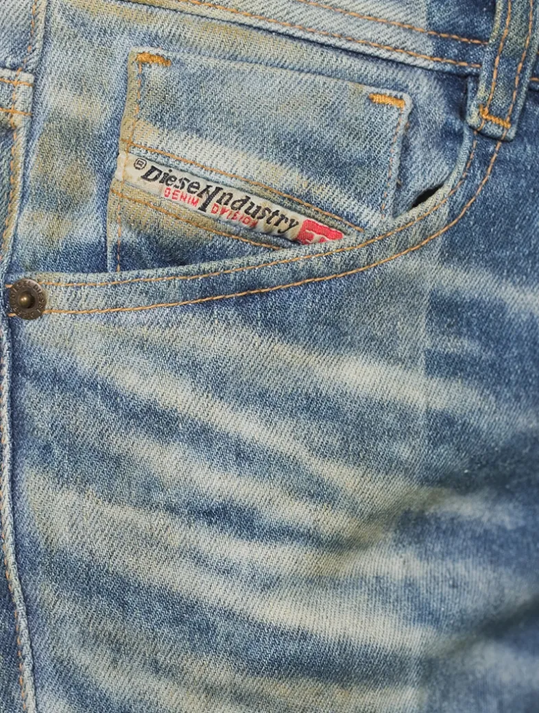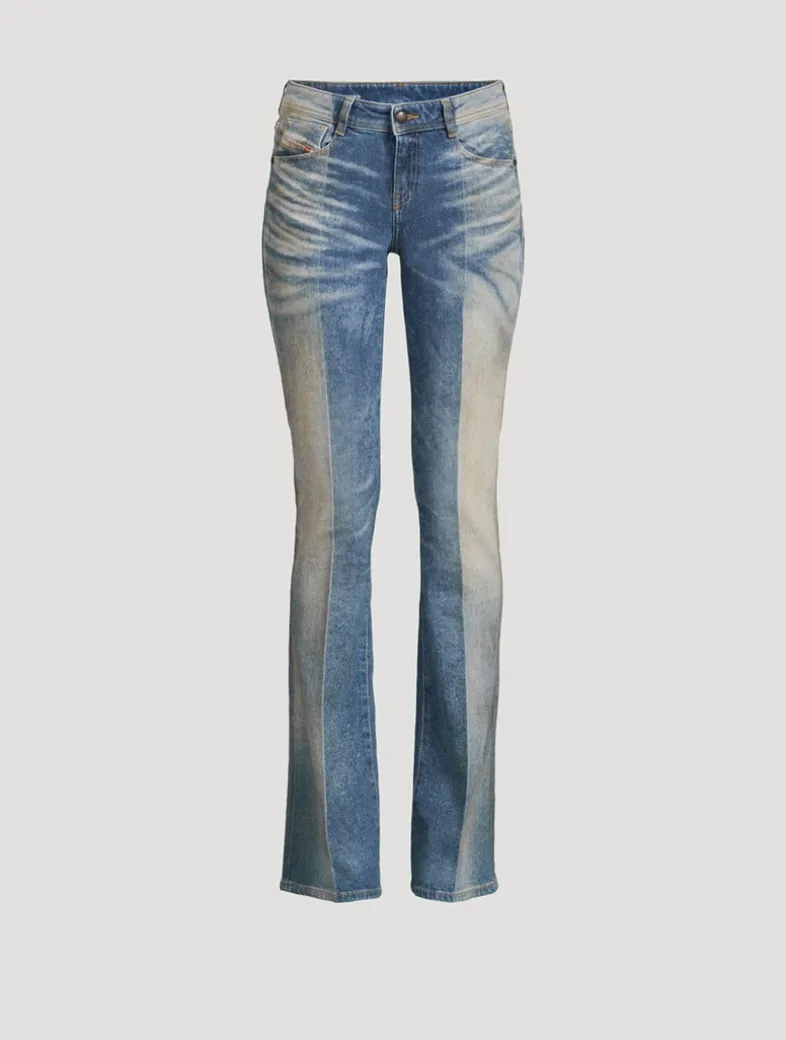 This bootcut style is designed with a low waist and higher back coverage. This classic slim jean with a bohemian attitude hugs the body from the hips to the knees. Made from comfort denim, the garment is carefully folded, sanded, and treated with a nebulised spray to obtain a signature sun-bleached effect where the fabric is exposed. Lasered artwork highlights worn areas and whiskers.