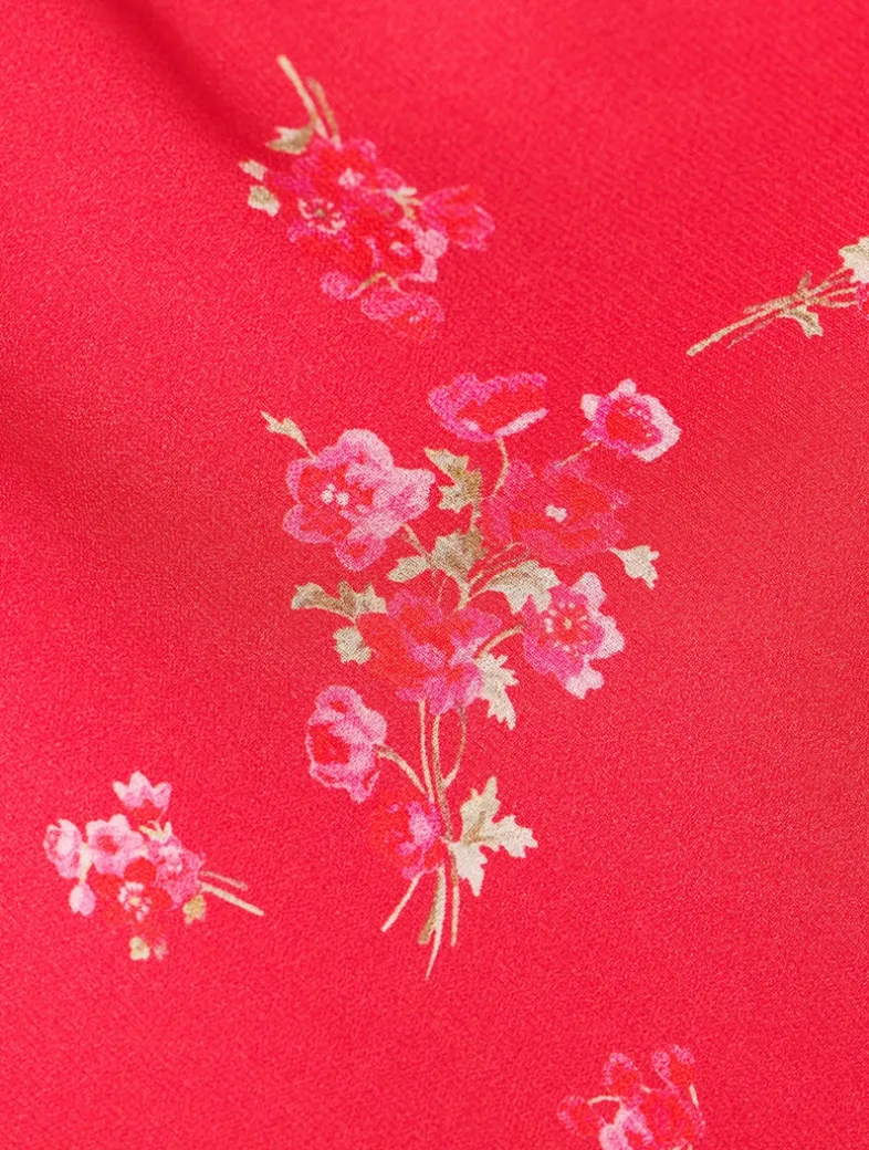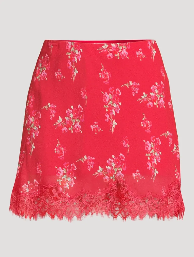 Embellished with an allover floral printed design, this short skirt is finished with a tonal lace trimmed hemline.