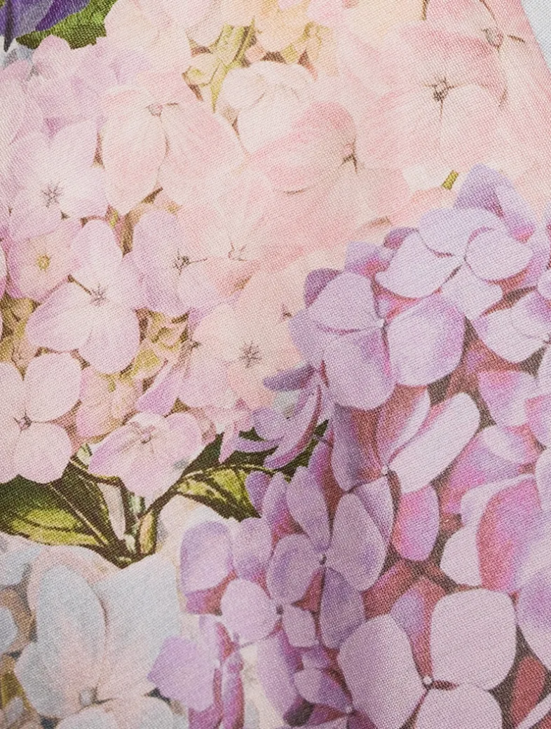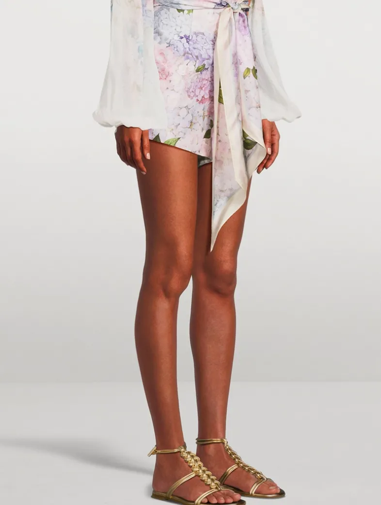 A high-waisted short featuring side seam pockets and a removable scarf belt, finished with a centre back zip. Crafted from silk, they are printed with a lovely hydrangea motif.