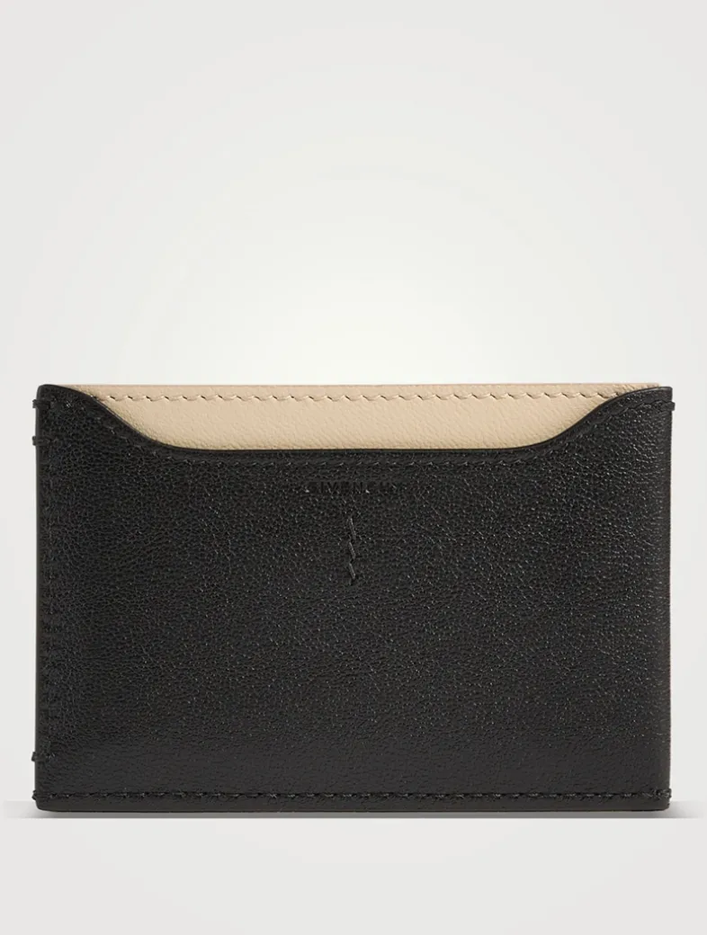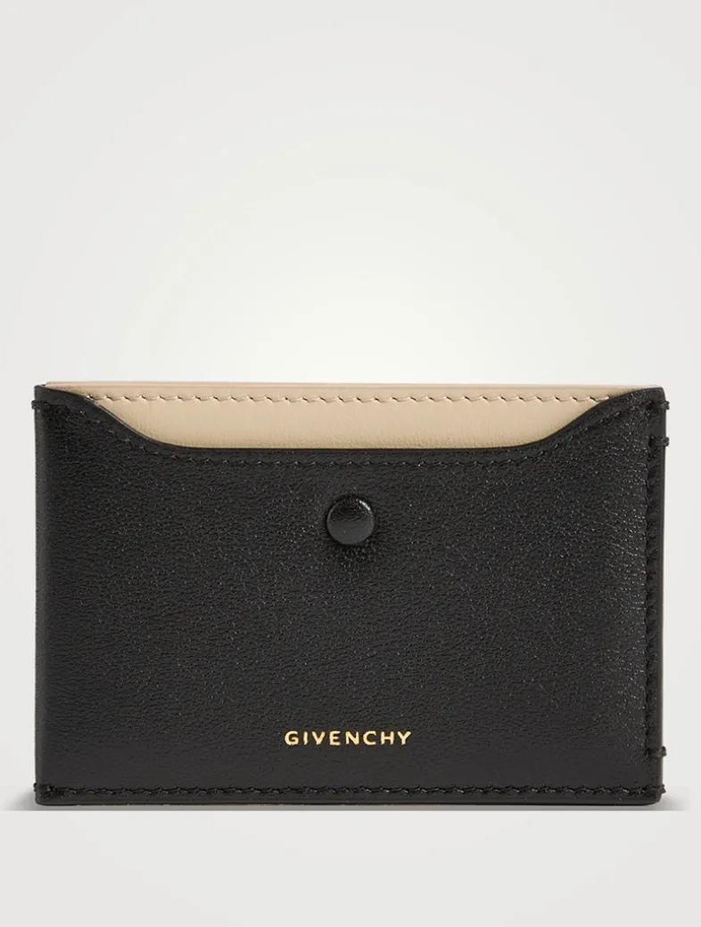 Crafted in shiny calfskin leather, this slim case features a leather-covered button on the front, three card slots, and a contrasted interior.