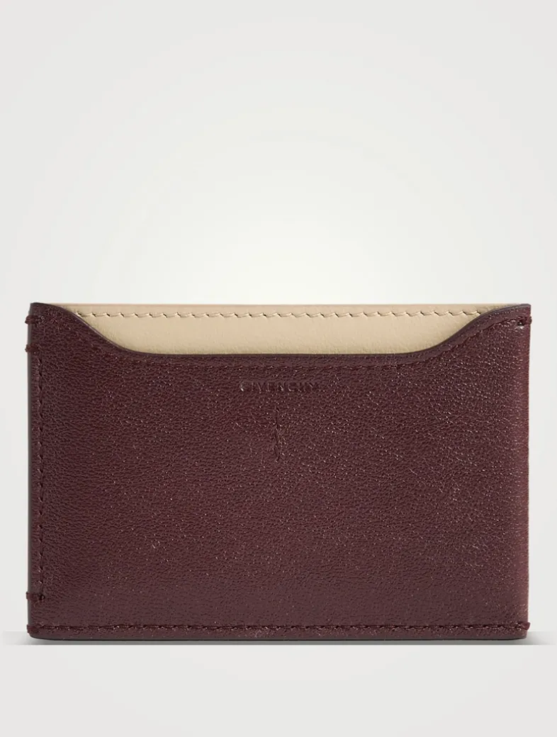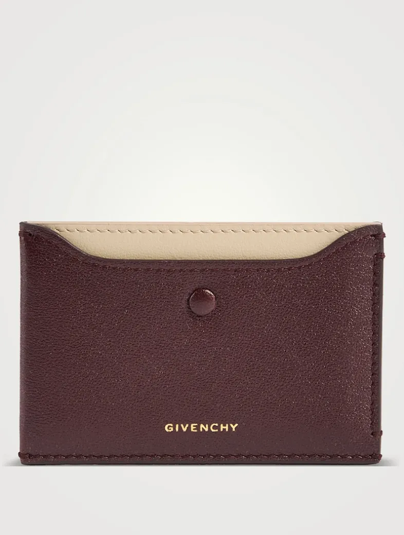 Crafted in shiny calfskin leather, this slim case features a leather-covered button on the front, three card slots, and a contrasted interior.