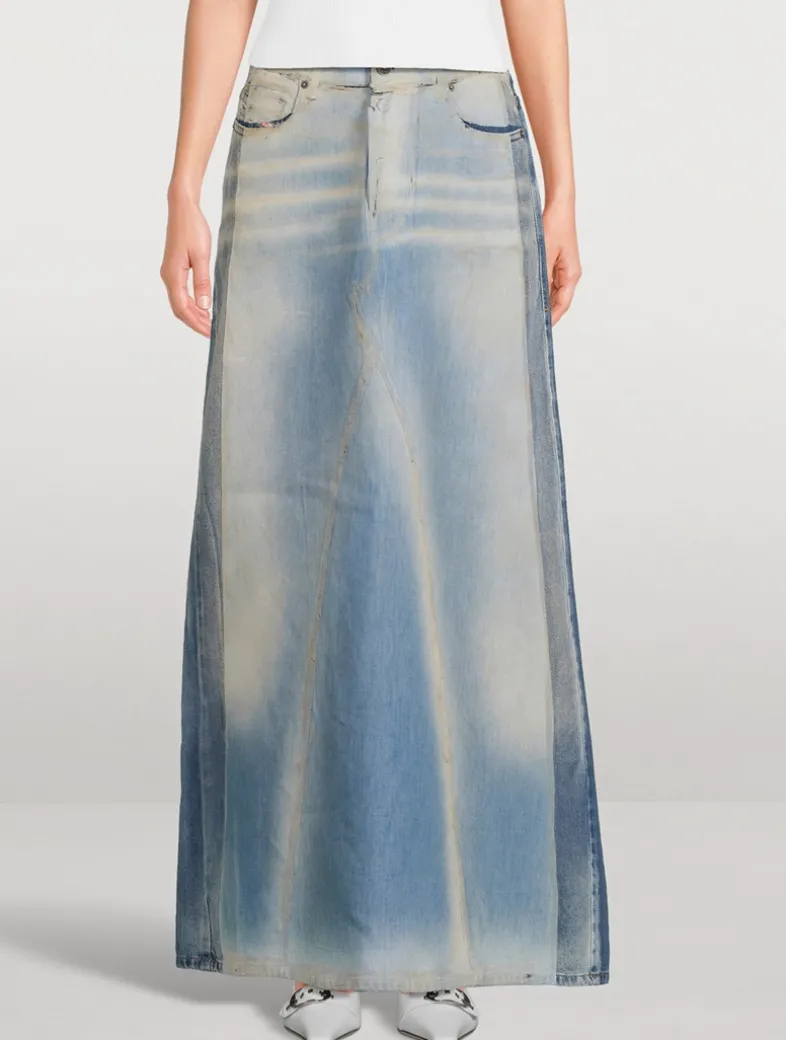 This denim skirt is a perfect example of Diesel’s unique know-how and pure rawness. The medium wash is bonded with a lighter denim on the front of the garment, pressed and worn to create iconic peel-off details. Washed-out and bleach effects enhance the colour contrast between the layers.