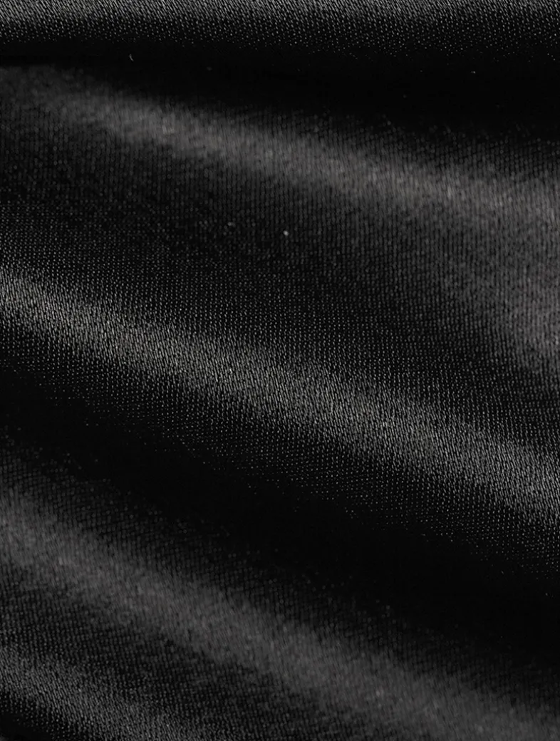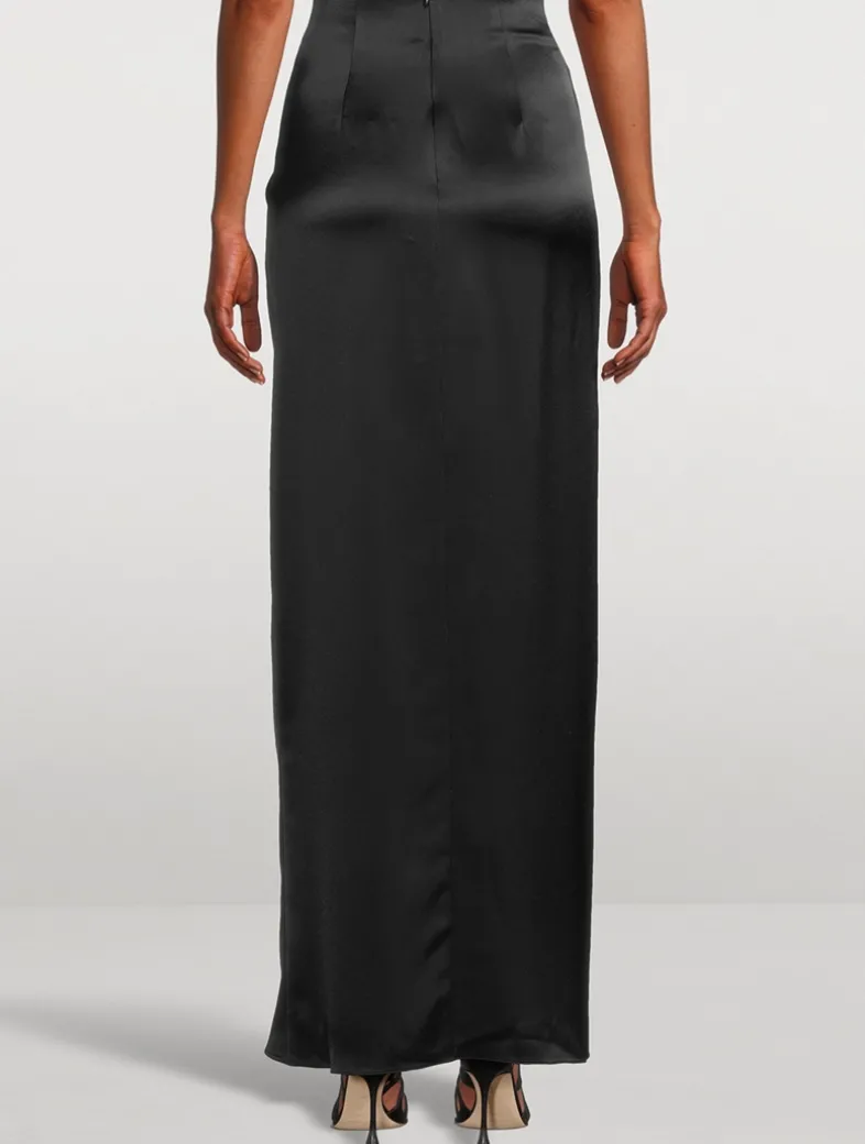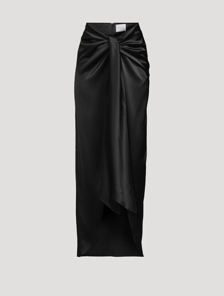 The DeLovie is a maxi-length skirt fabricated in luxurious satin fabric with a glossy sheen. Designed to sit high on the waist, it has a gathered accent and cut-up-to-there front slit.