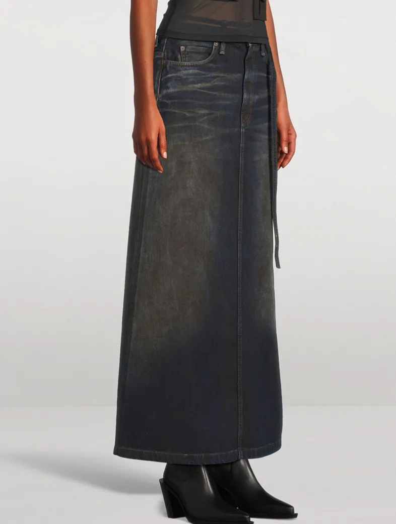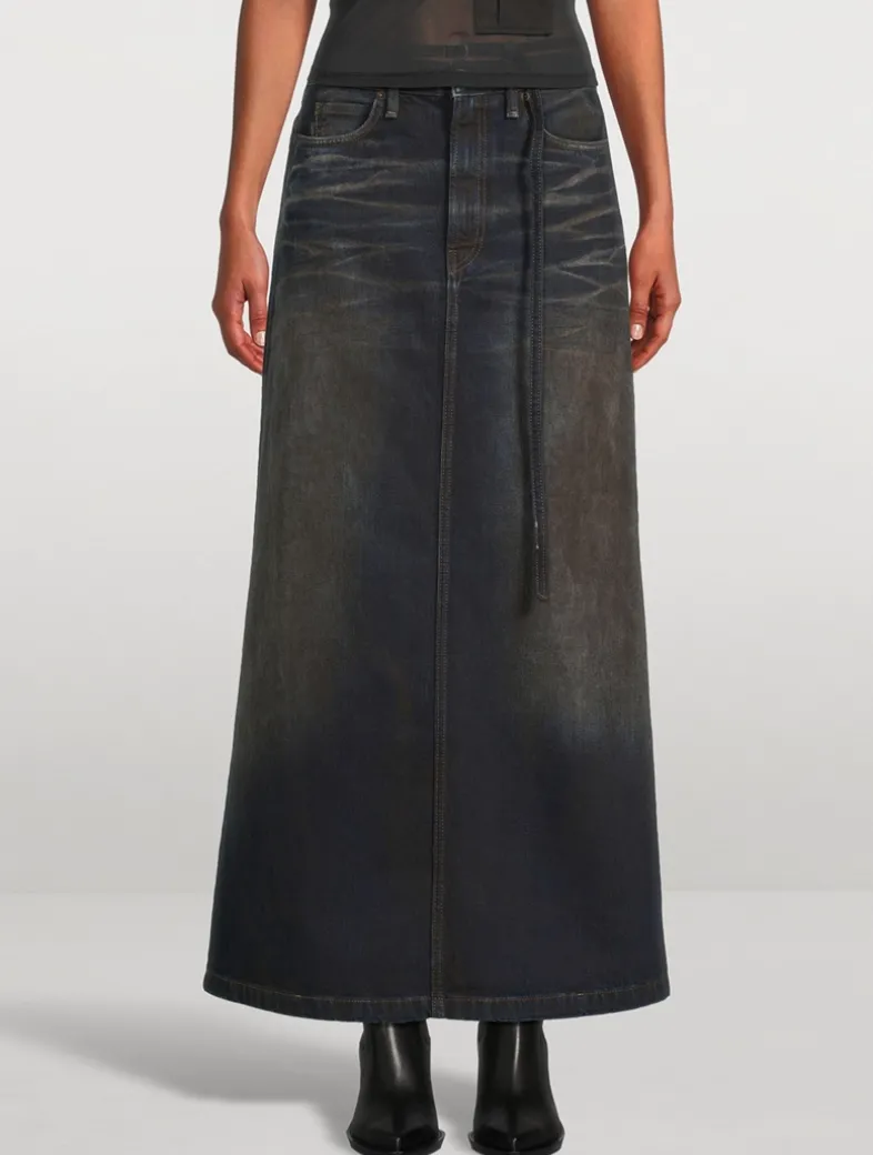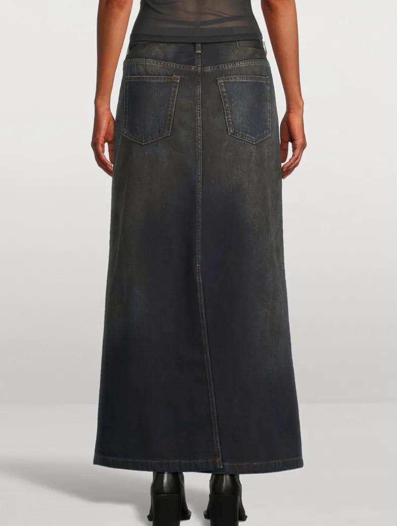 Made in Italy, this skirt is cut to a regular fit with a flared shape, high-rise waist, and ankle length. Crafted from a cotton denim detailed with a five-pocket design and a rear vent.
