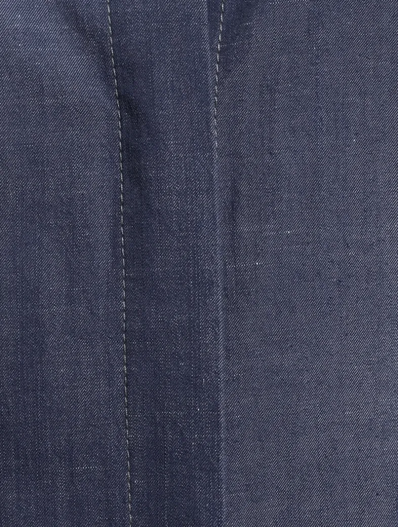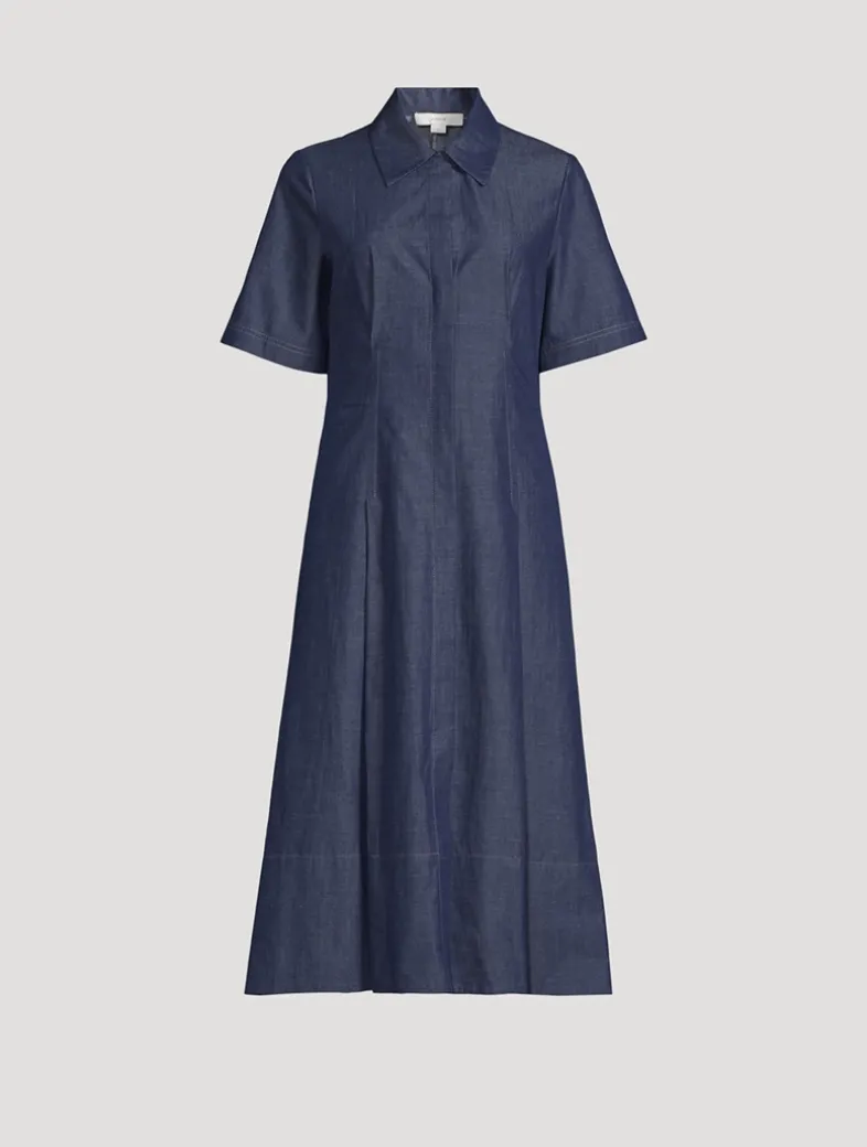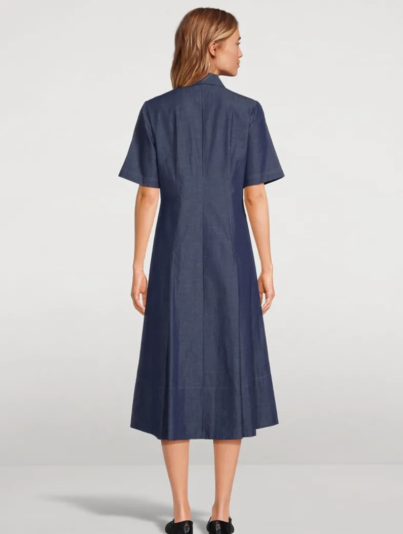 Made from a cotton-blend denim, this midi offers a modern take on a classic style. The bodice of this shirt dress has a pointed collar and short sleeves, while the skirt falls to a flared silhouette.