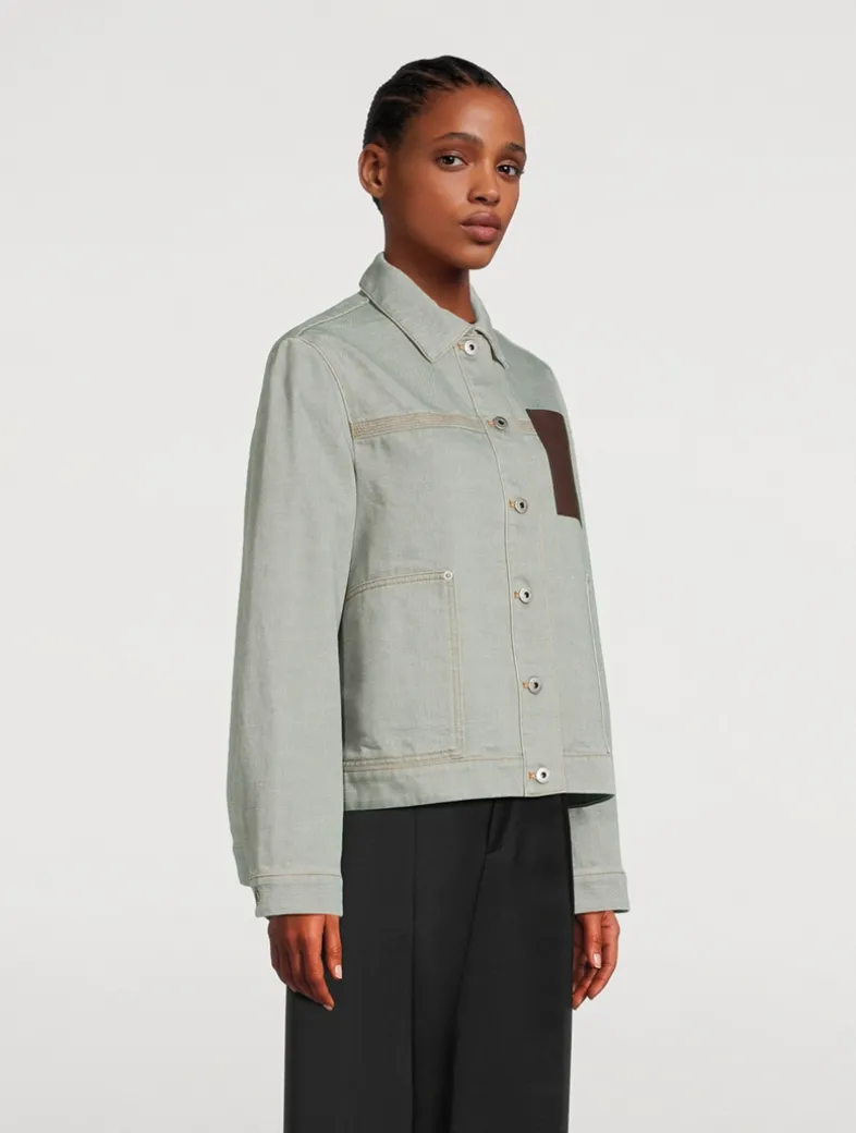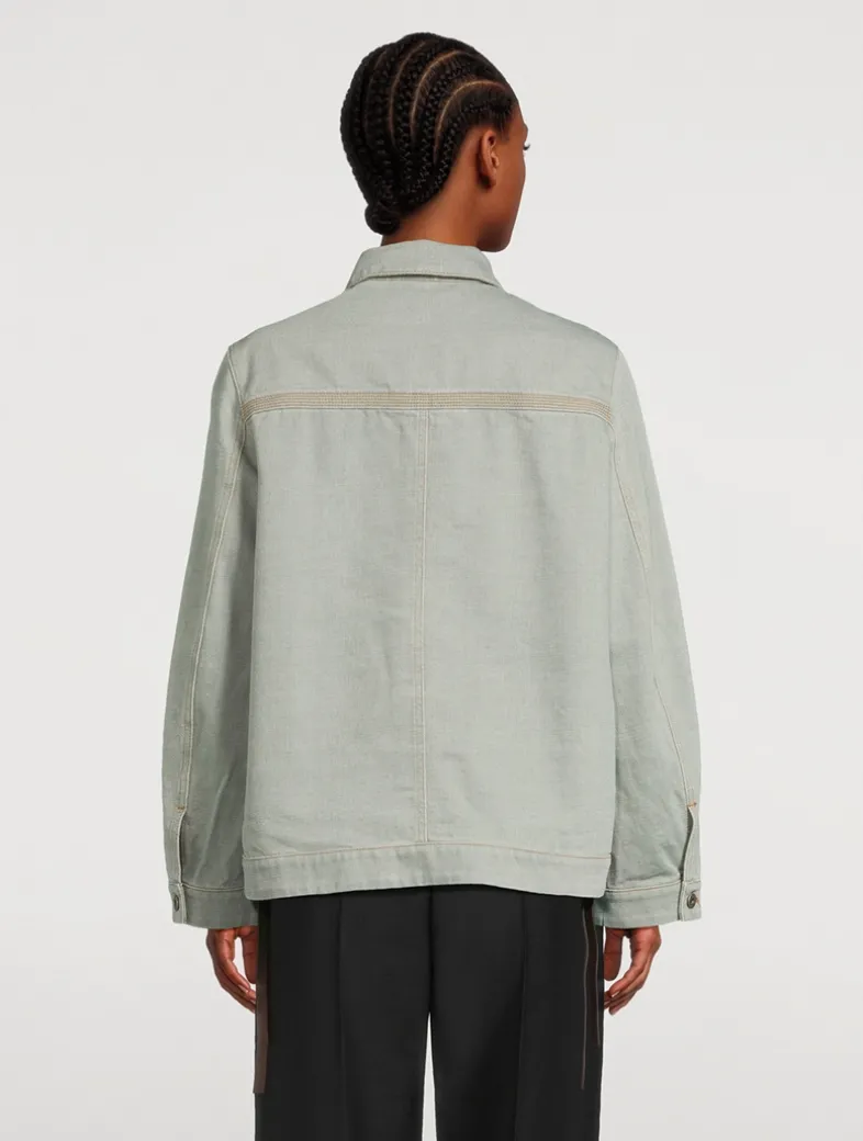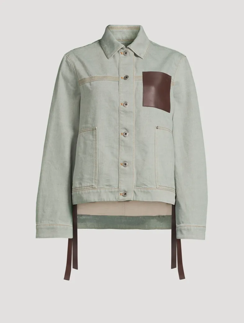 Flaunting a utilitarian look, this jacket is crafted in medium-weight washed cotton denim. It features patch pockets, an asymmetric front to back hem with ties at the sides, and a buttoned closure.