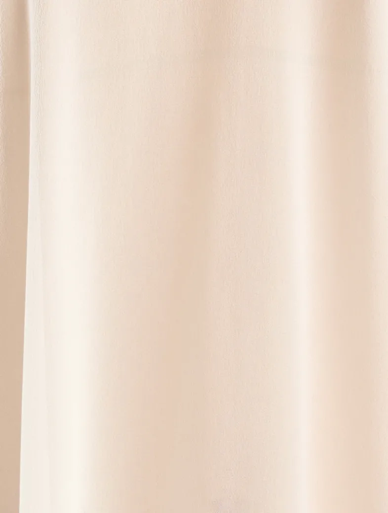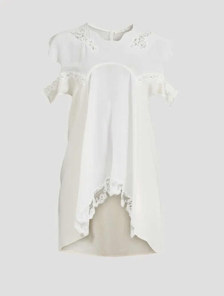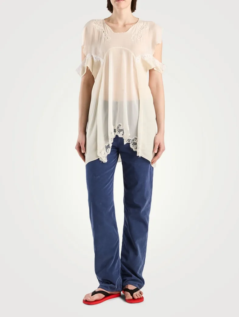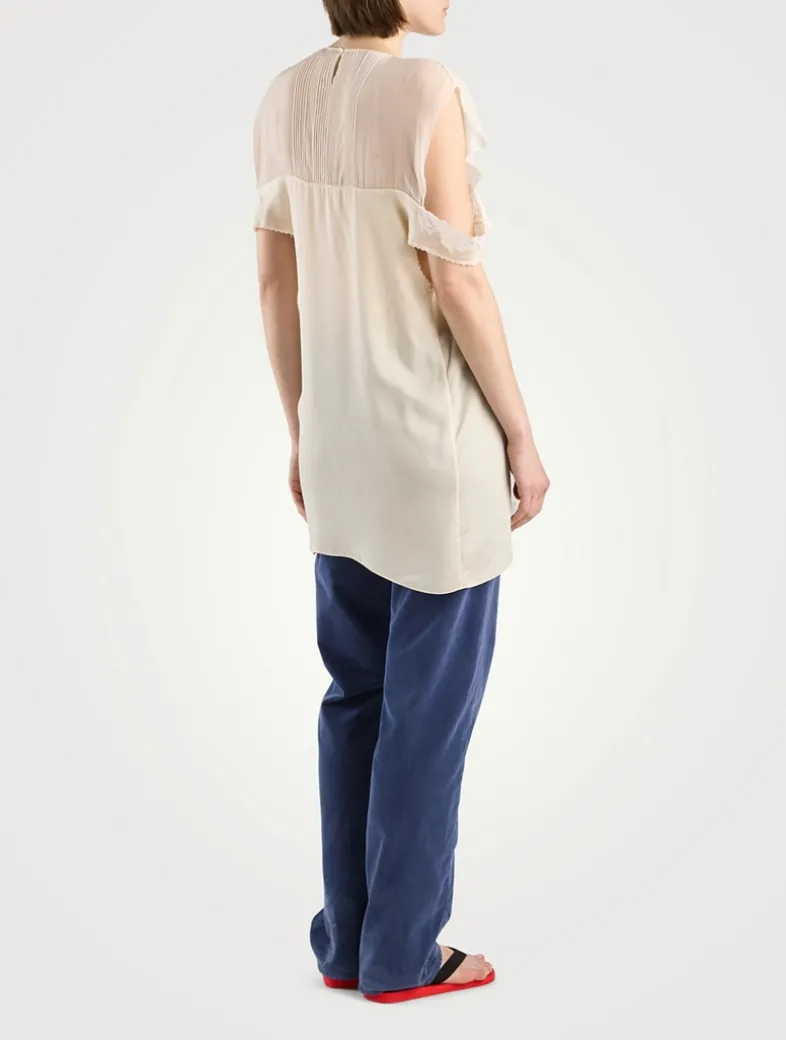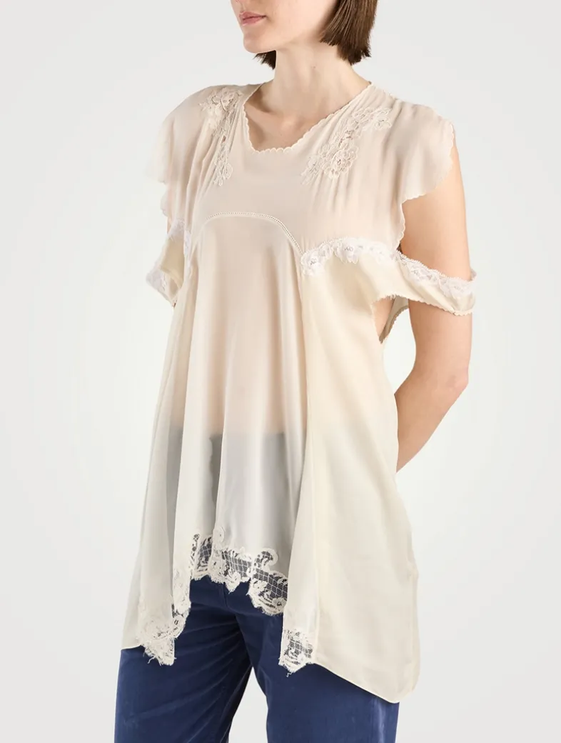 Draped in a lightweight silk georgette with scalloped embroidery at neckline and sleeves, this filmy blouse has open shoulders with lace straps. Finished with a center back loop closure with mother-of-pearl button.