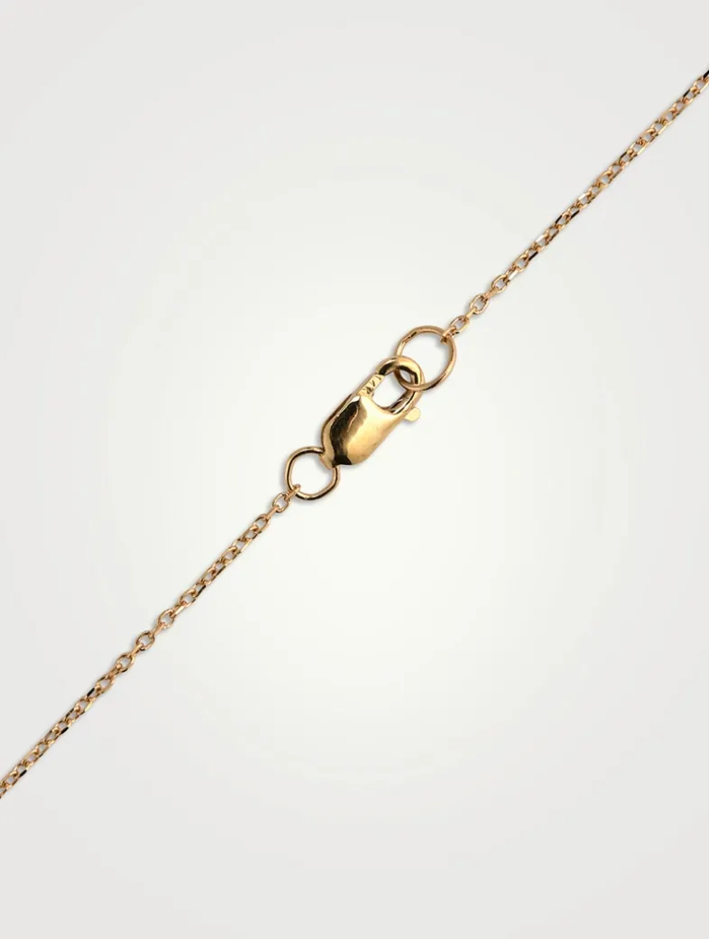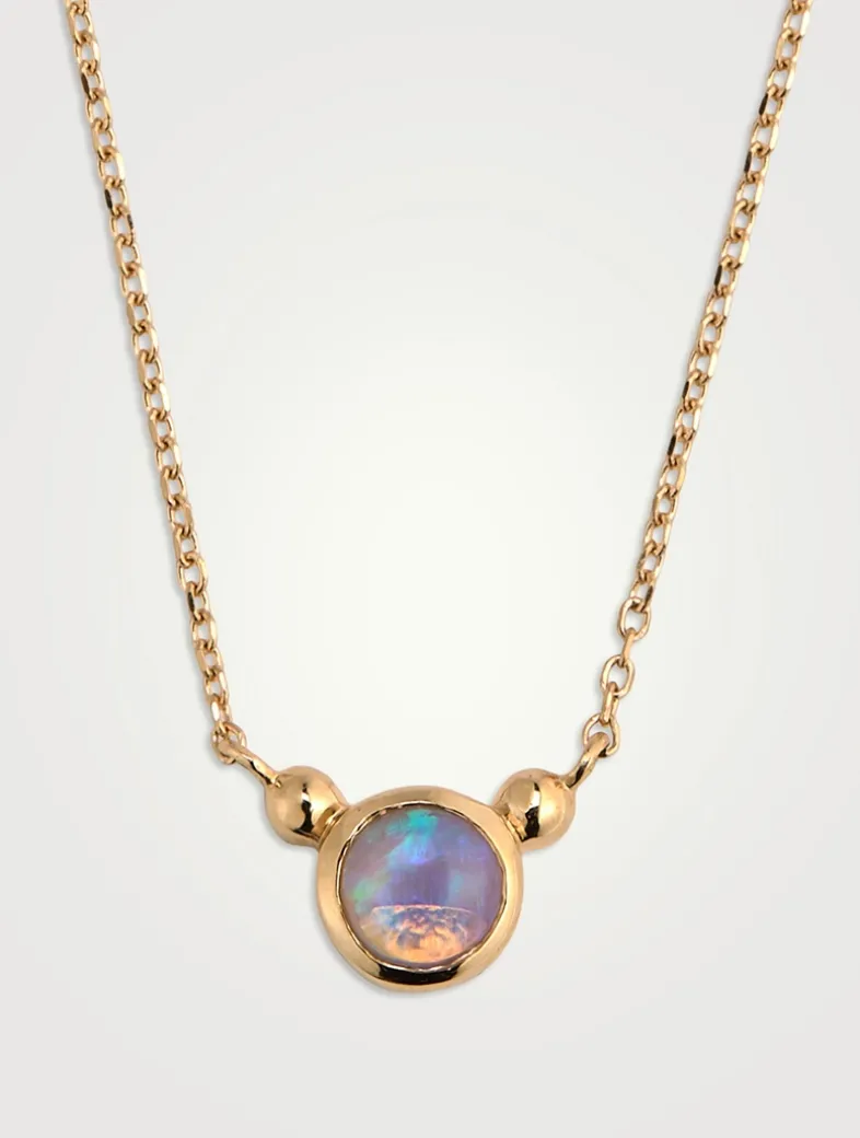 Bezel set and suspended from a sparkling chain, this opal pendant necklace is petite and dainty. Crafted in 14k gold with the brand’s signature dew drop detailing.
