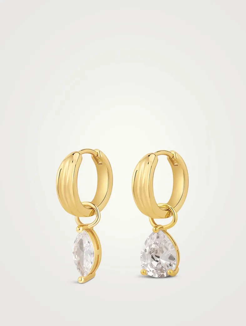 These ridged hoop huggies with asymmetrical, removable CZ charms from the Dezi x Luv Aj collection are made from plated brass with waterproof, tarnish-free 14K gold plating. Featuring high-quality cubic zirconia and hypoallergenic surgical steel posts, they’re 100% nickel- and cadmium-free.